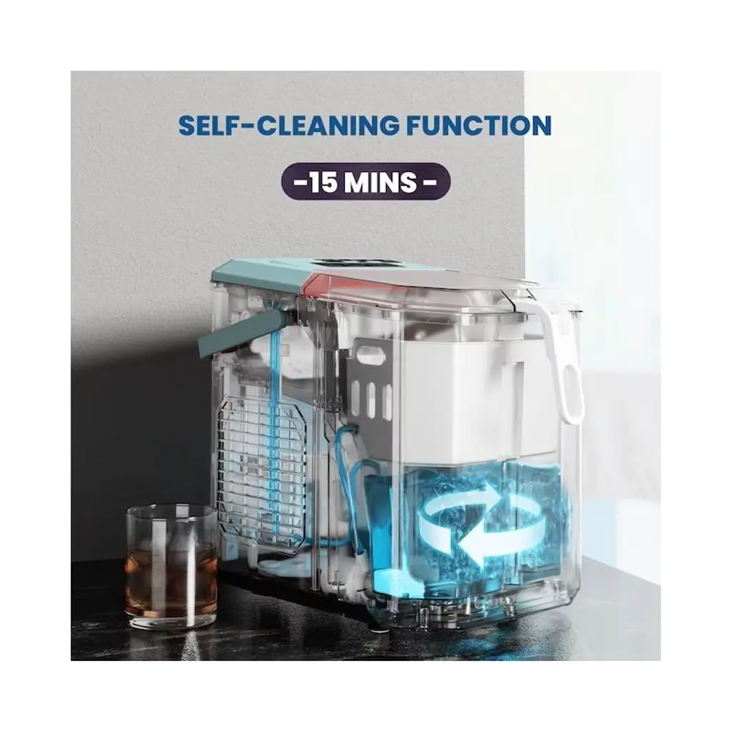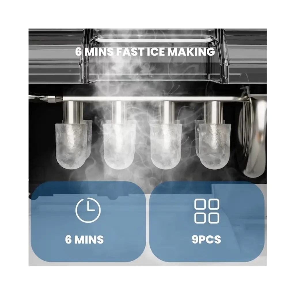 The portable countertop ice maker is the easiest and perfect way to bring ice into your home. Equipped with a high efficiency R600A compressor, this ice maker is capable of making ice quickly, with each round taking 5-12 minutes to make 9 pieces of Half-Cube-shaped ice per cycle, making up to 26LB of ice in a day. Select S/L size of ice cubes to meet your different need. It is equipped with an auto-cleaning function, simply fill the water tank with water and then long press the ice making/cleaning button for 5 seconds to start the auto-cleaning. It will be the perfect addition to your kitchen. The large window allows you to keep the ice cool while checking on the production. Featuring with portable yet compact design, this premium ice maker machine is perfect for home, office, parties.