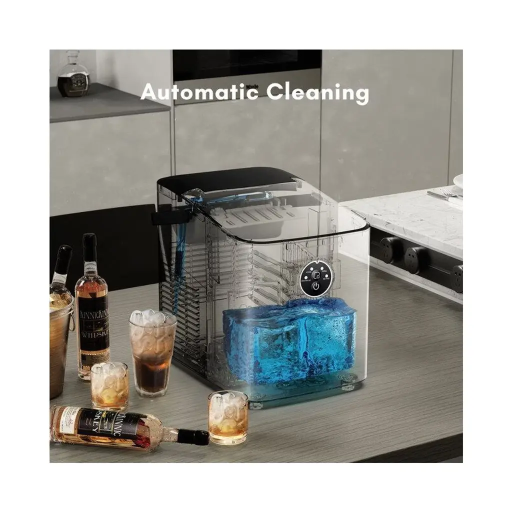 Our ice cube maker can produce 16 pcs of ice cube every 6-12 mins and up to 26 lbs in 24 hours. Each block of ice is crystal clear and shines irresistibly like a diamond. This compact ice maker looks great in your kitchen but is also versatile enough to make 2 sizes of ice cubes for any occasion by select the size options.It is equipped with an auto-cleaning function, simply fill the water tank with water and then long press the ice making/cleaning button for 5 seconds to start the auto-cleaning. It will be the perfect addition to your kitchen. Featuring with portable yet compact design, this premium ice maker machine is perfect for home, office, parties, and bars. This Countertop Ice Maker keeps you in a steady supply of ice for entertaining at home or everyday use.
