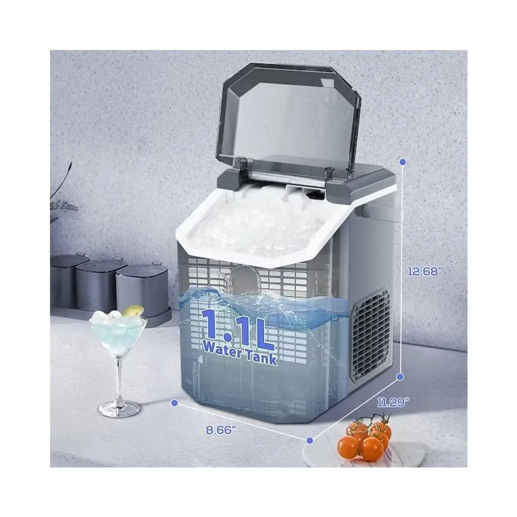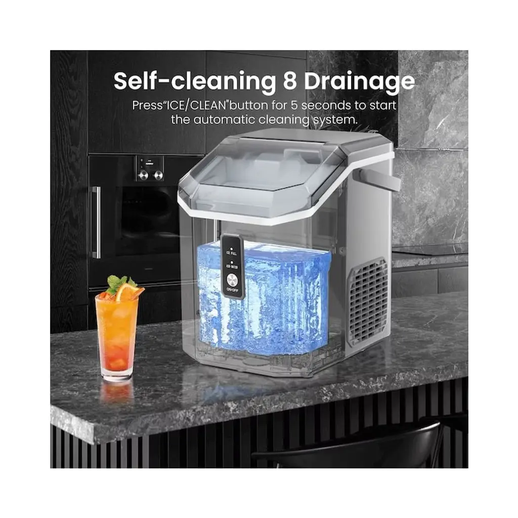The portable 34 lbs/24 hours nugget ice maker is the easiest and perfect way to bring ice into your home. All you have to do is fill the water tank with 1.1 L water, turn it on, and let it run. Making ice within ONLY 7 minutes, equipped with an ice basket that holds up to 1.5 lbs, and in 24 hours you can make 34 lbs of ice, you are never going to run out of ice! As well, this device produces low decibels and is entirely energy efficient. The self-cleaning function provides you with clean ice, and makes it last to use. It will be the perfect addition to your kitchen. The large window allows you to keep the ice cool while checking on the production. A high-density polyurethane foam layer with good thermal insulation effectively isolates external heat and slows the melting of ice. Unlike traditional hard cubes, our nugget ice is soft and chewable, friendly to the teeth, and suits people of all ages. Its airy texture soaks up your favorite beverage and makes it a joy to chew.