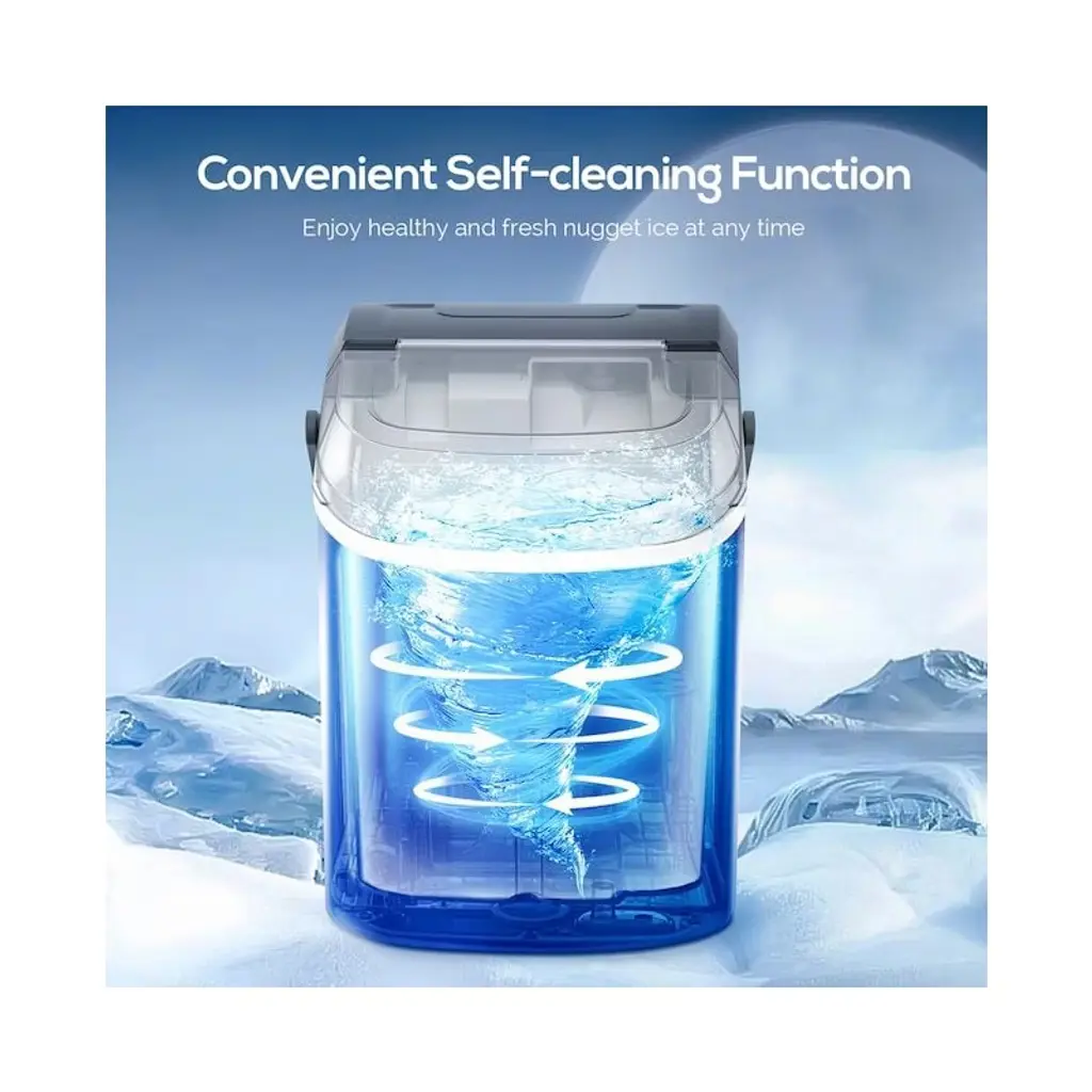 The portable 34 lbs/24 hours nugget ice maker is the easiest and perfect way to bring ice into your home. All you have to do is fill the water tank with 1.1 L water, turn it on, and let it run. Making ice within ONLY 7 minutes, equipped with an ice basket that holds up to 1.5 lbs, and in 24 hours you can make 34 lbs of ice, you are never going to run out of ice! As well, this device produces low decibels and is entirely energy efficient. The self-cleaning function provides you with clean ice, and makes it last to use. It will be the perfect addition to your kitchen. The large window allows you to keep the ice cool while checking on the production. A high-density polyurethane foam layer with good thermal insulation effectively isolates external heat and slows the melting of ice. Unlike traditional hard cubes, our nugget ice is soft and chewable, friendly to the teeth, and suits people of all ages. Its airy texture soaks up your favorite beverage and makes it a joy to chew.