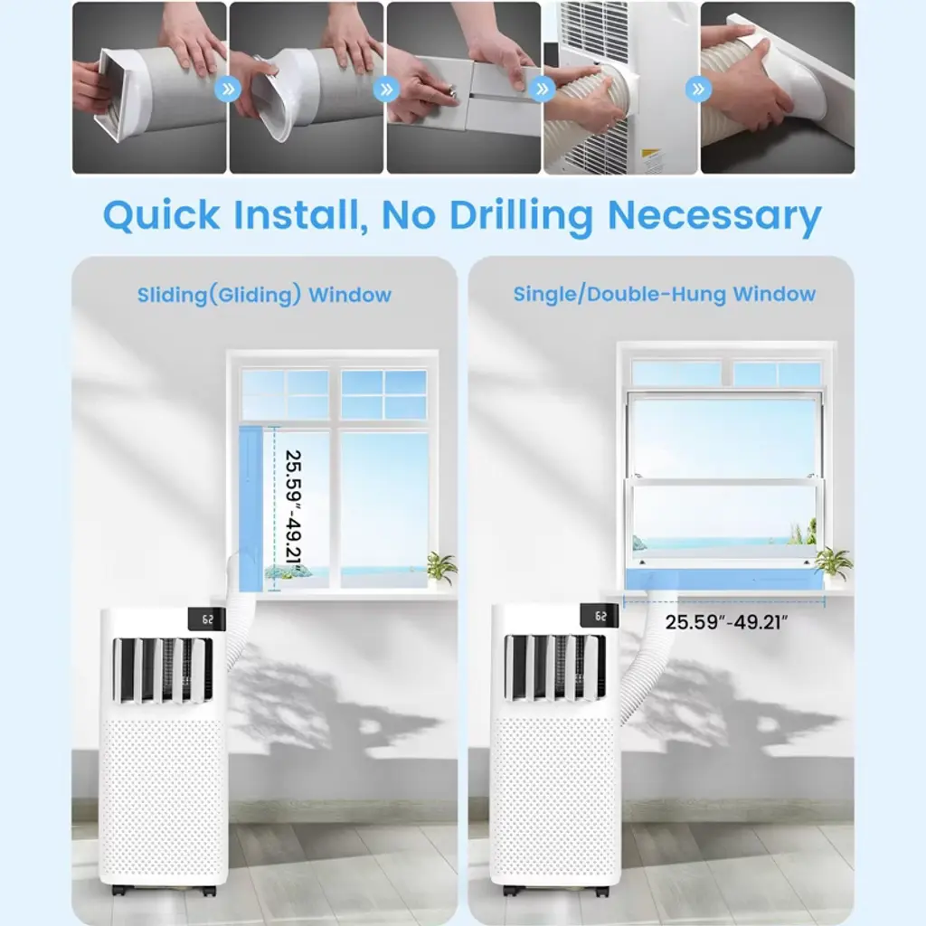 The Kismile portable air conditioner keeps your home cool and comfortable when and where you need it. Use year-round with a supplemental heat option. Remove excess moisture with dehumidifying dry mode and capture dust from the air with an easy-to-clean washable filter. Enjoy maximum comfort and quiet operation throughout the evening hours with sleep mode and 24 h timer. The louver is manually adjustable, change the air direction, offering you customizable comfort. The temperature can be adjusted between 61F and 90 F. And the operation is easy using through the control panel or remote control. The installation is effortless with included window installation kit and instructions. All with the ability to easily move from room to room using caster wheels. Please note that do regularly clean the air filter(commonly clean every 2 weeks).