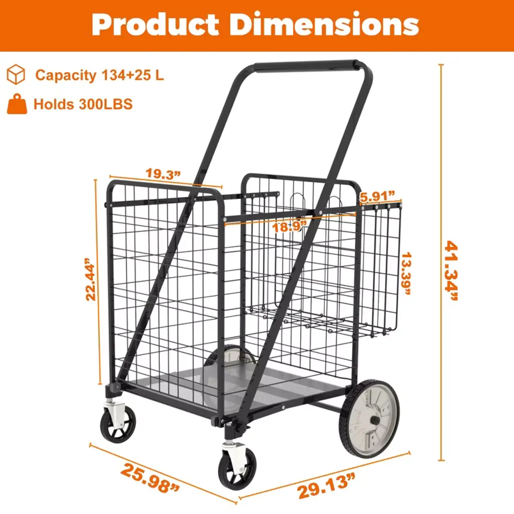 The Folding Shopping Cart is constructed with high-quality, low-carbon stainless steel, allowing you to effortlessly carry up to 170kg of items. With its front large basket measuring 19.2 * 14.9 * 22.4 inches , and the extra back basket measuring 5.9 * 19.2 * 13.3 inches.