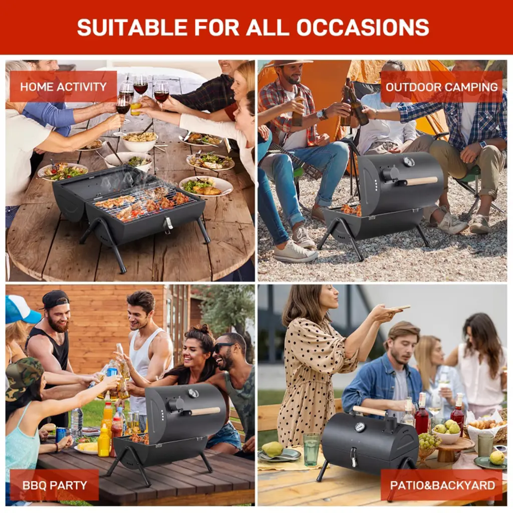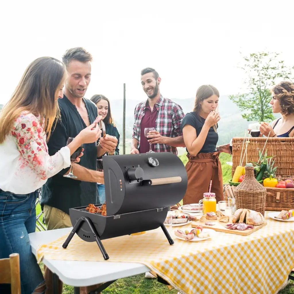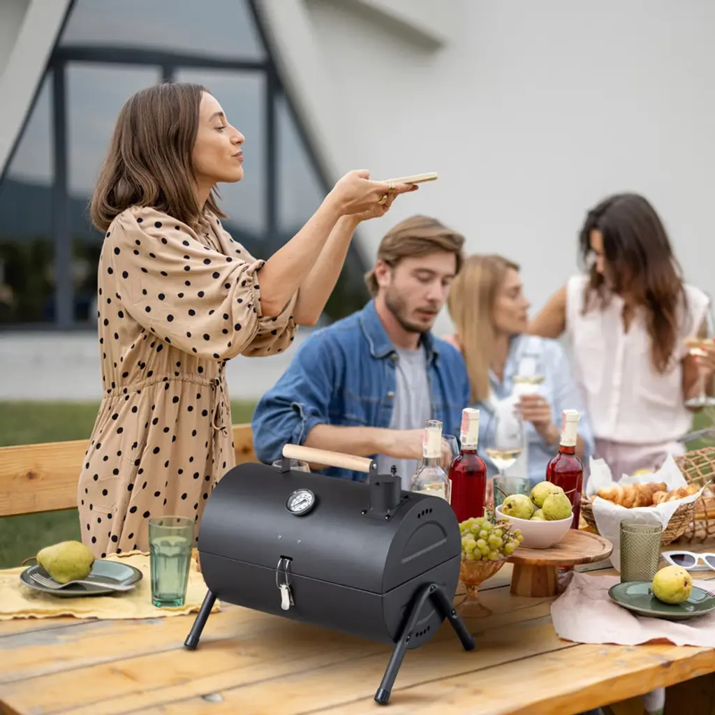Experience the joy of grilling anywhere you go with our Portable Charcoal Grill, the perfect companion for outdoor adventures and intimate backyard gatherings. This compact and durable grill is designed with convenience in mind, featuring a wooden handle for easy transport, a secure lid lock for on-the-go, and a built-in thermometer for precise cooking. Whether it's for a picnic, camp-out, or a cozy cookout in your own backyard, this grill's portability and performance make it an essential tool for any BBQ enthusiast.