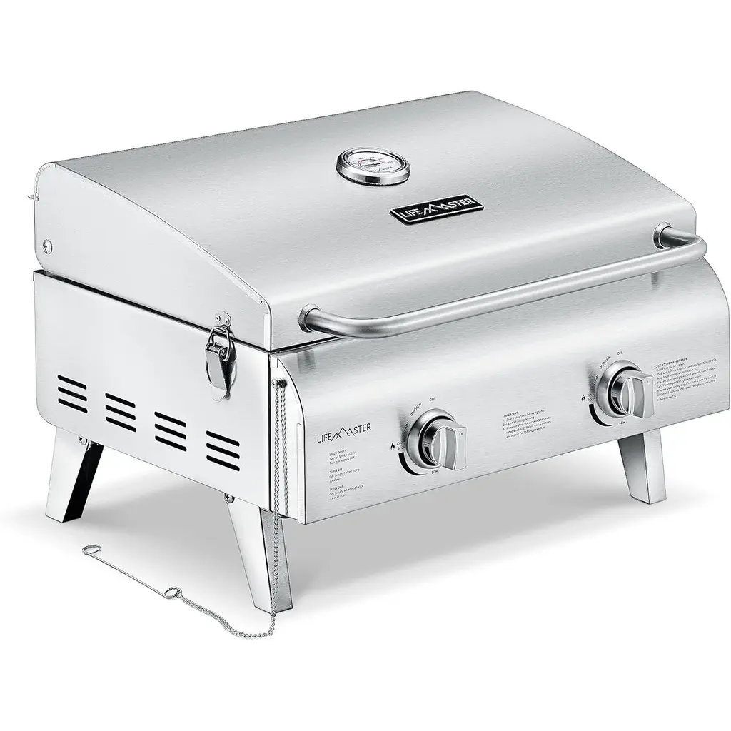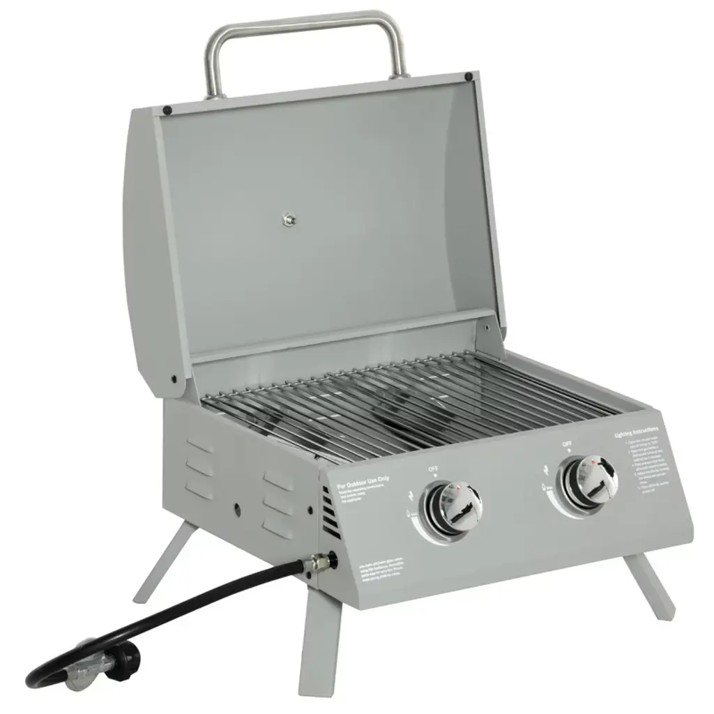 Fire up flavorful meals wherever you go with this compact 2-burner propane gas grill, designed for easy portability and outdoor convenience. The spacious cooking surface with two grill grates lets you cook for small gatherings with ease, while each burner operates independently with its own piezo ignition for reliable start-ups. A built-in lid allows you to smoke your food to perfection, and the top-mounted thermometer helps you monitor heat without lifting the cover. Four foldable legs make it easy to collapse and transport the grill in your trunk, ideal for camping, tailgating, or balcony barbecues. Cleanup is simple thanks to the pull-out grease tray, and all necessary connections like the regulator and hose come included so you’re ready to grill right out of the box.