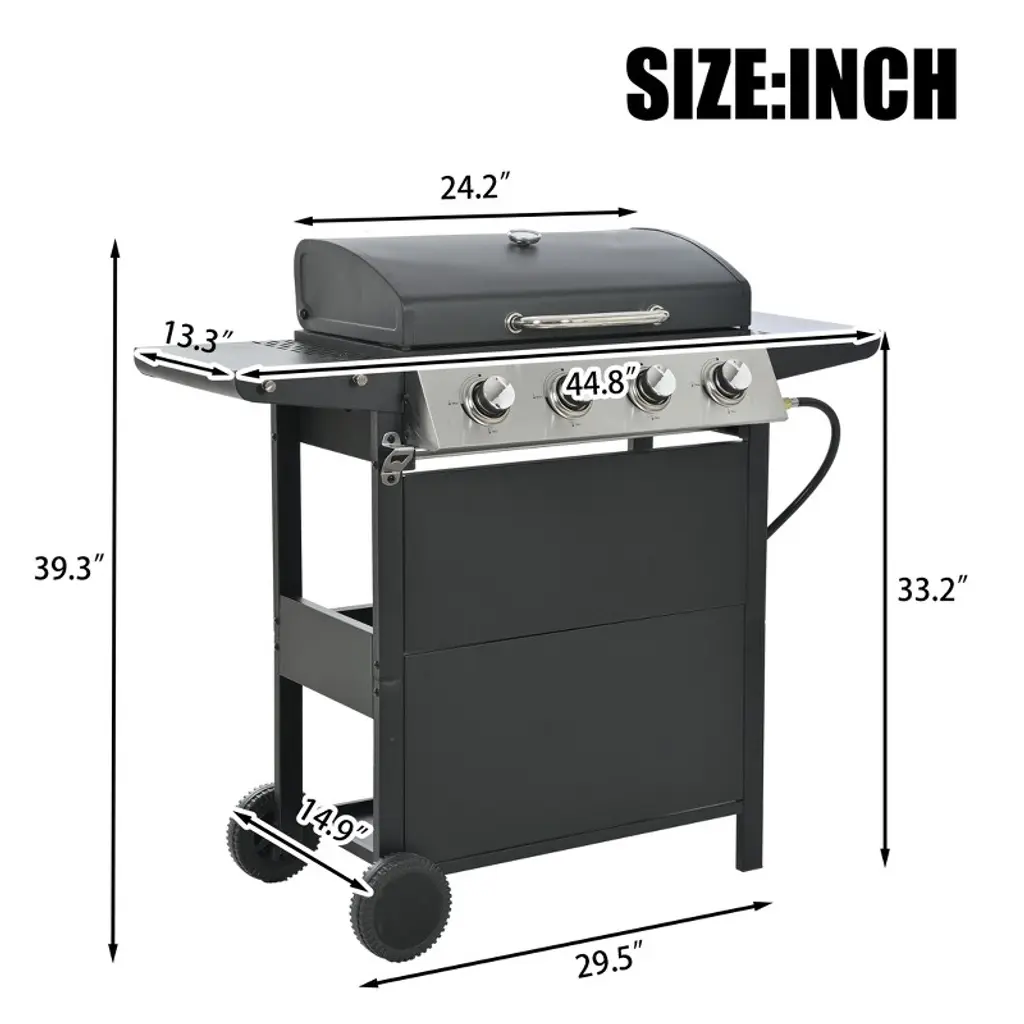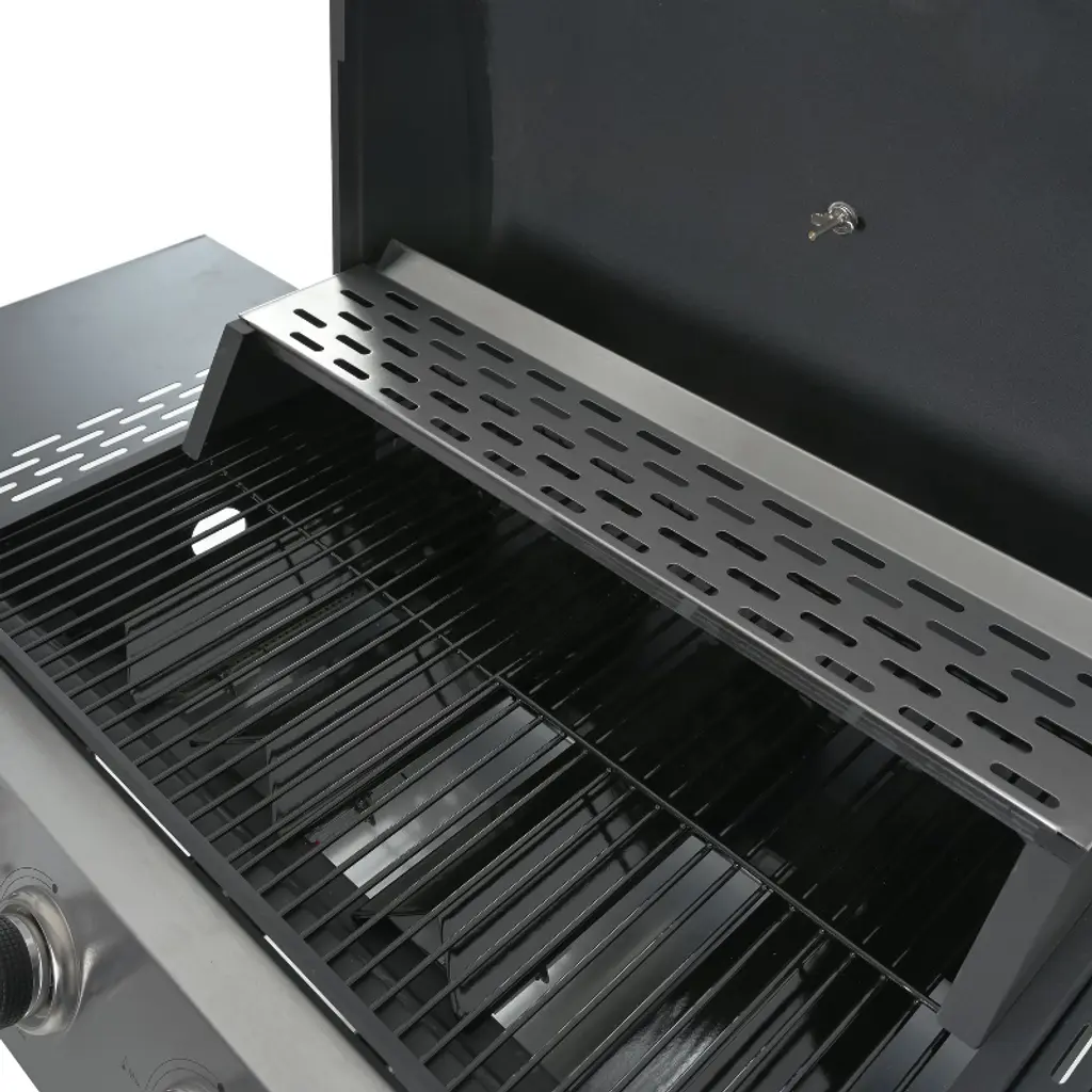Experience versatile outdoor cooking with this durable 4-burner propane gas grill delivering 34,000 BTUs per hour. Equipped with high-quality stainless steel burners and an integrated piezoelectric ignition system, it starts quickly and reliably with a simple push and turn of the control knob. The sleek stainless steel control panel features chromium-plated knobs, providing a sturdy yet refined look, complemented by a stainless steel handle and built-in thermometer on the lid for precise temperature monitoring. The spacious cooking area includes porcelain-enameled wire cooking grates measuring 23.6" x 13" for cooking and a warming rack of 23.2" x 4.7" to keep food ready. Two side shelves offer ample prep and storage space, while the built-in wheels and bottle opener add convenience for any backyard, garden, courtyard, terrace, or balcony setting. Ideal for year-round grilling and entertaining.
