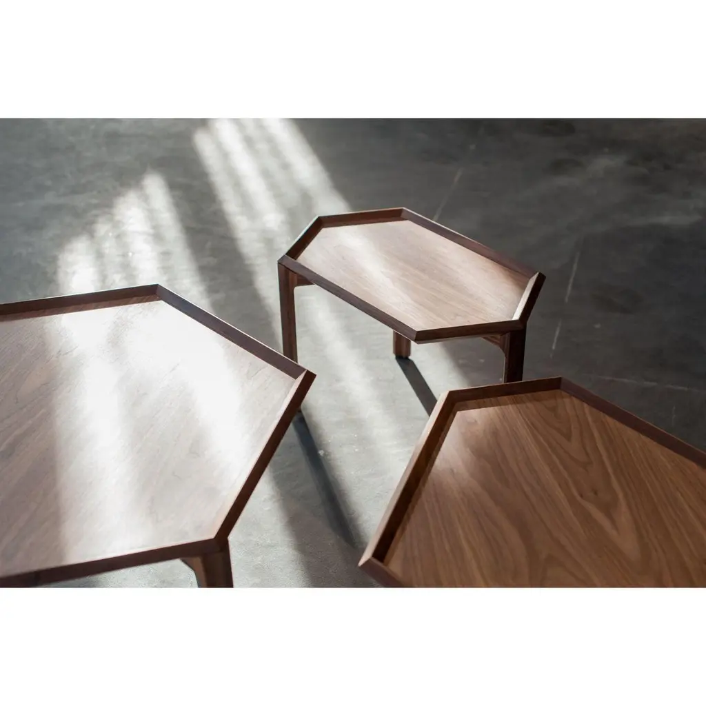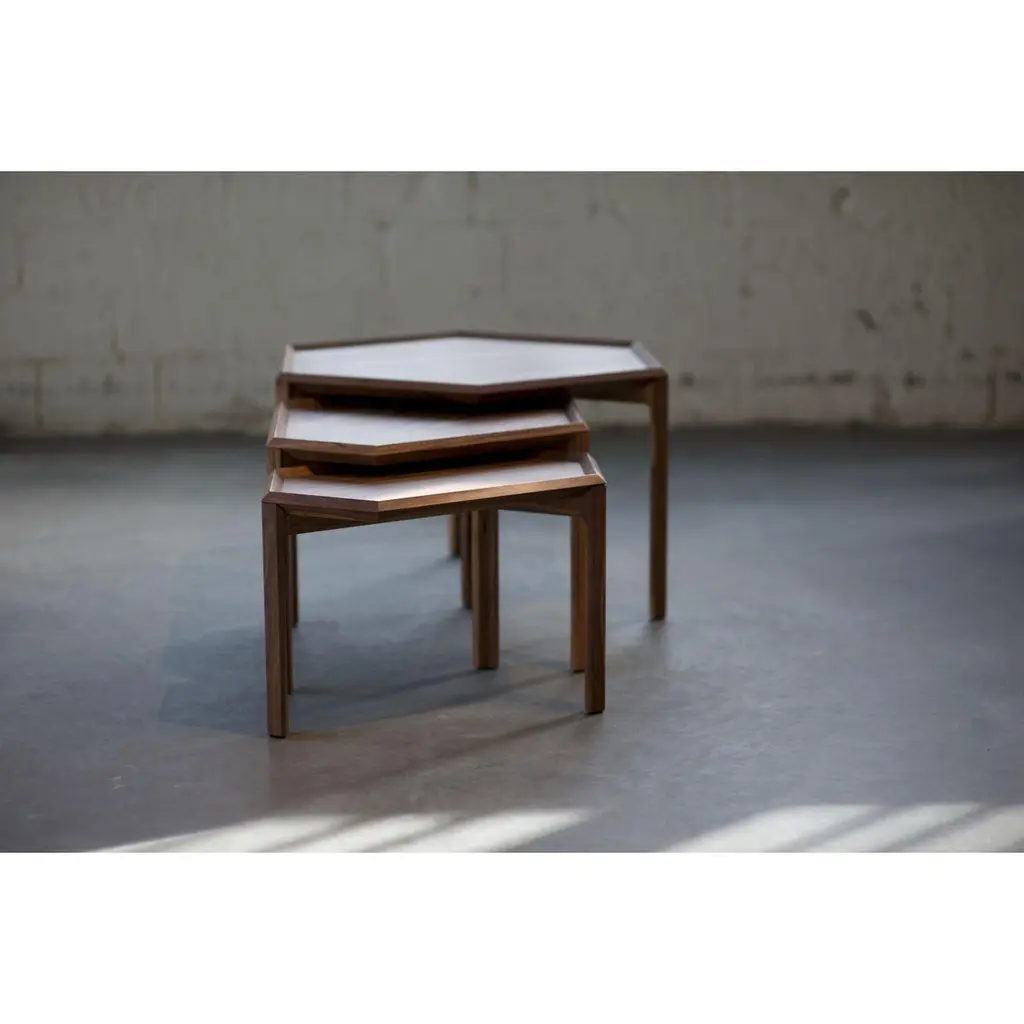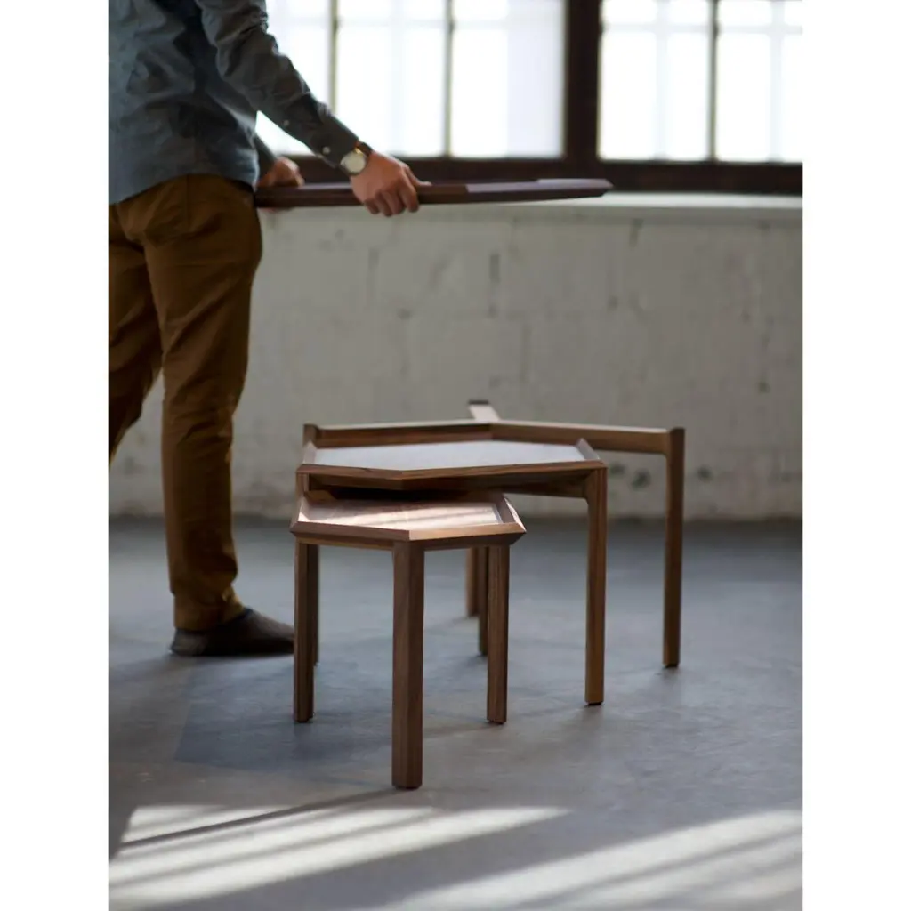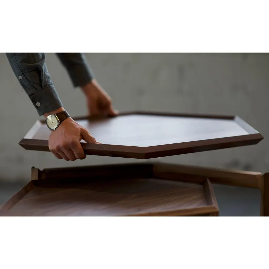 Kuusio Table by Antrei HartikainenMaterials: Elm, maple, walnut, natural oil waxDimensions: W 60-70, D 30-80, H 38-46cmAlso Available: Dark color & different flower amounts, Kuusio, a set of three flat-packed stacking table & tray combinations, is based on the shape of the hexagon. The tables may be employed singly or in a variety of combinations. Flat-pack: the table top works as a tray.Antrei Hartikainen is a master cabinetmaker and designer from finland known for his exquisite works in wood. The award- winning pieces, including functional products and pure art works, achieve heights of sensuality, elegance and craftsmanship. These important factors are emphasized in Antrei Hartikainen’s work, which constantly seeks to challenge and blur the traditional categorizations between functional objects and visual arts. Hartikainen’s sculptural approach can be studied through his organic body of work, which simultaneously highlights the inspiration drawn from his material of choice, wood. Antrei hartikainen has shown his works in numerous solo and group exhibitions all over the world . Antrei have been awarded with prize as a Young Designer of the Year 2018 in Finland and shortlisted as Emerging Designer of the Year 2019 by Dezeen awards.