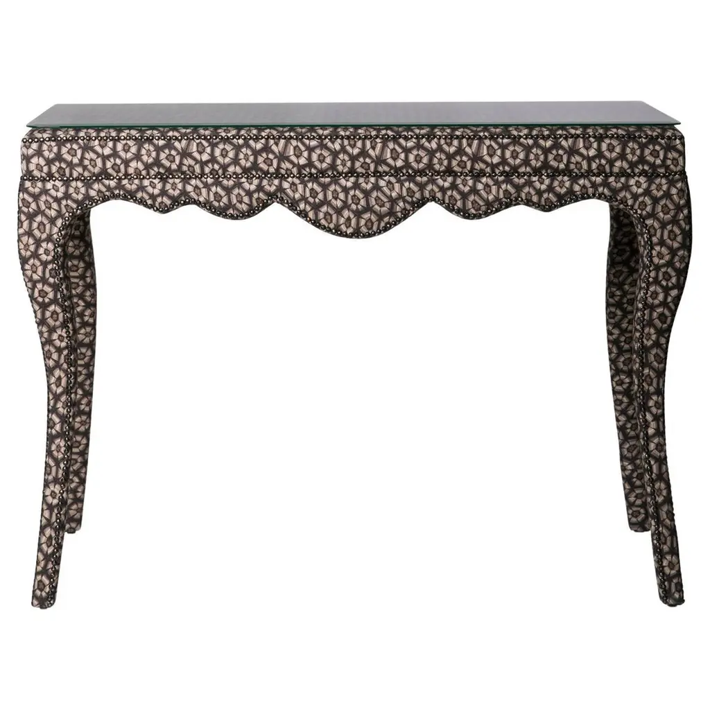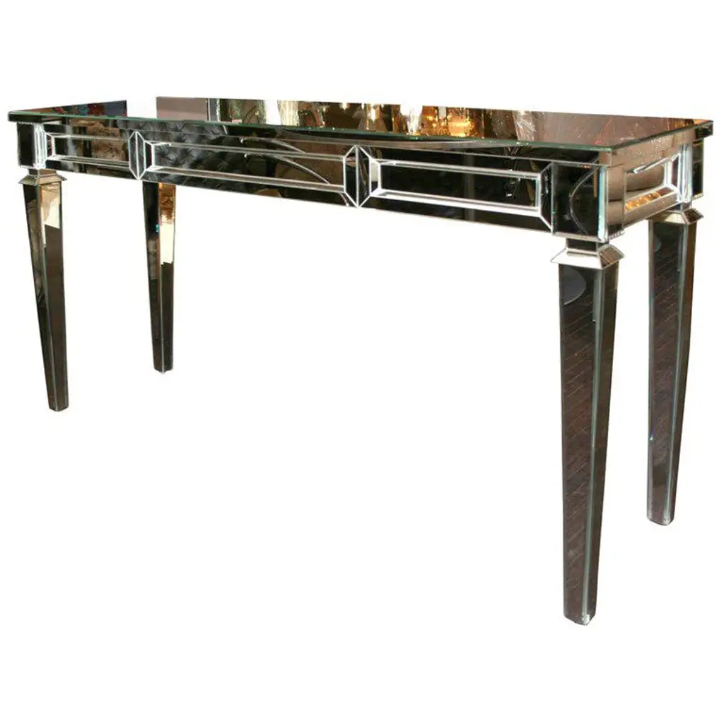 Exquisite in its elegant simplicity, the L. Vivarini Console Table is crafted from mirrored, ground and hand engraved glass, all uniting to form this stunning table that will add a touch of glamour to any formal lounge room or entry hall. The intricate etching with a sandstone wheel adds beautiful detail around the edge of the table top.