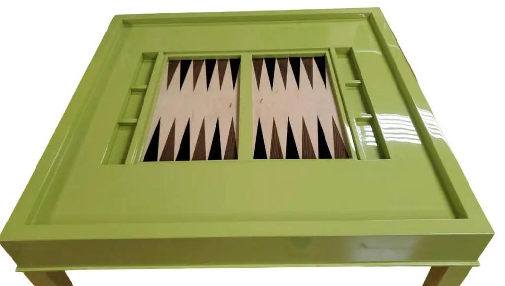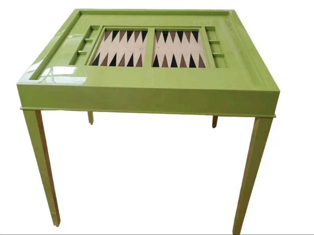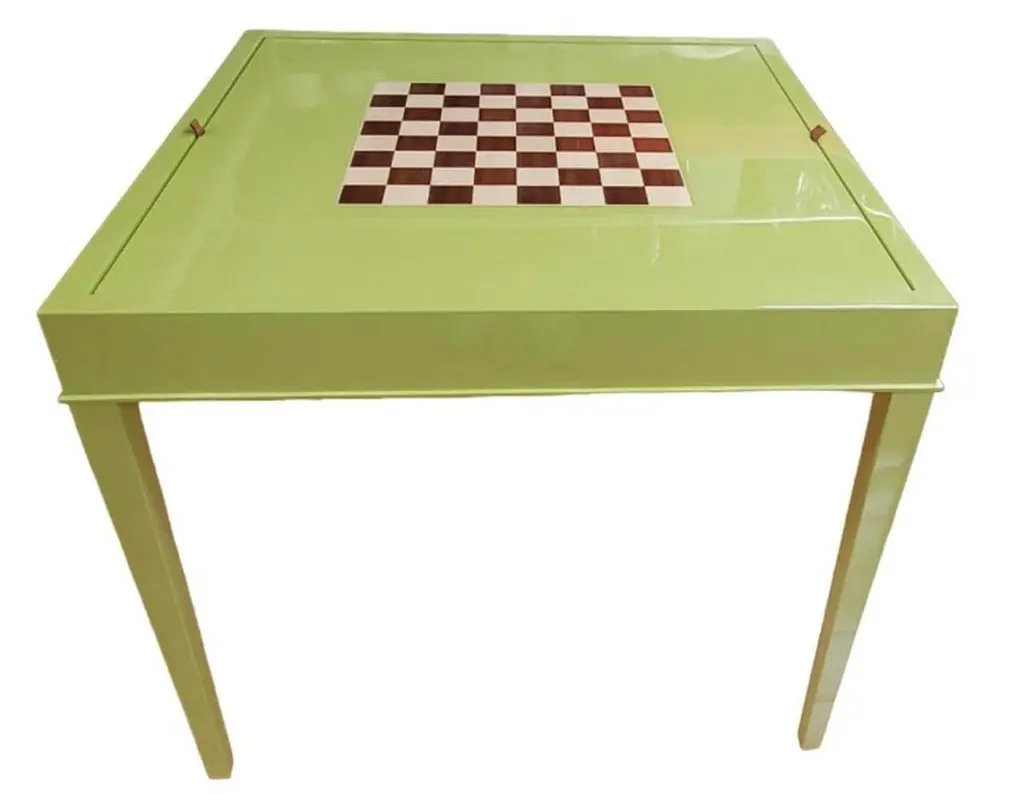 Custom walnut or mahogany table with removable top that exposes the backgammon board. The top can be flipped over to expose the chess board. Perfect size to play cards, poker, board games etc. The marquetry is integrated into the top. Can be made in your preferred size and color. New production. Designed and made in NYC by Janine Carendi MacMurray, each table is handcrafted within NYC and has unique attributes. One-day delivery available in NYC. As shown in light brown, in walnut. 4-5 lead time, from approval of stain sample approval.
