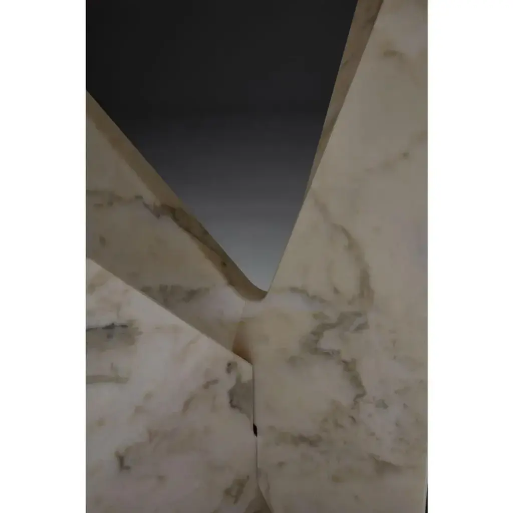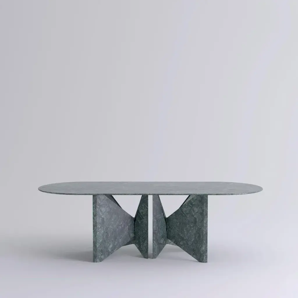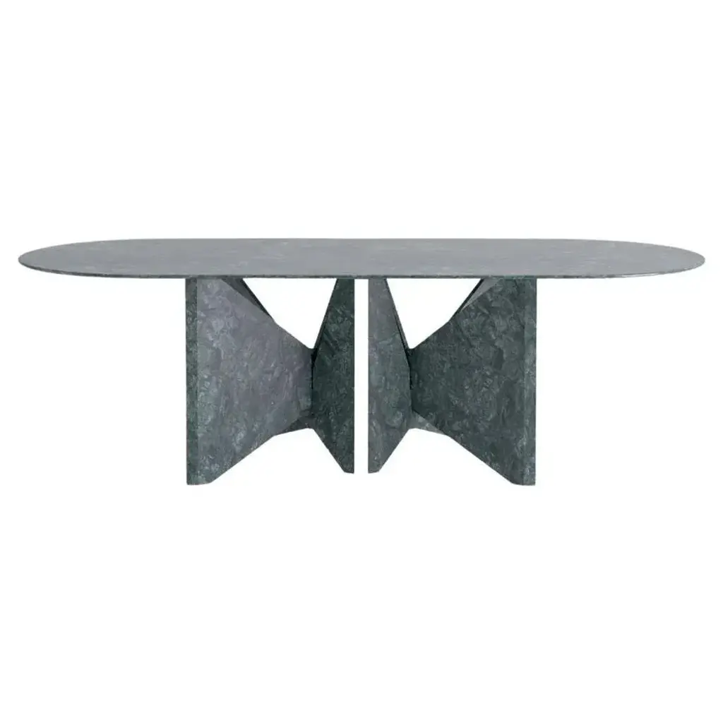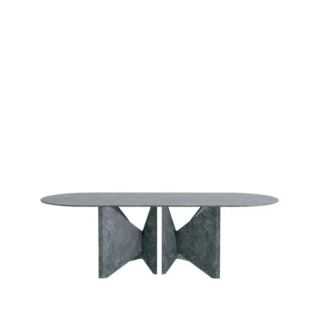 Lamina oblong table by Hannes Peer Dimensions:D 250 x W 60 x H 76.5 cm Materials: Indian Green marble. Also available in different finishes. Lamina is a dinner table relying on the intersection of marble slabs. Hannes Peer drew his inspiration from the conceptual work of architects Claude Parent (France) and John Lautner (US) who liberated architecture from the classic “cubic” spaces and introduced movement through oblique lines in their buildings in the 60’s. The interlocking triangle shaped legs of Lamina gives it both a sense of equilibrium and dynamism.