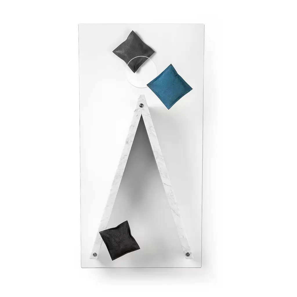 Versatile for a range of settings, from stylish living rooms to sophisticated game rooms, Lancio showcases a unique design featuring a low-iron glass top atop a marble base, available in various finishes. Complementing this elegant structure are eight meticulously handcrafted cornhole bags wrapped in luxurious Alcantara crafted by skilled Italian artisans. The artwork includes premium metal components, ensuring both durability and aesthetic appeal.