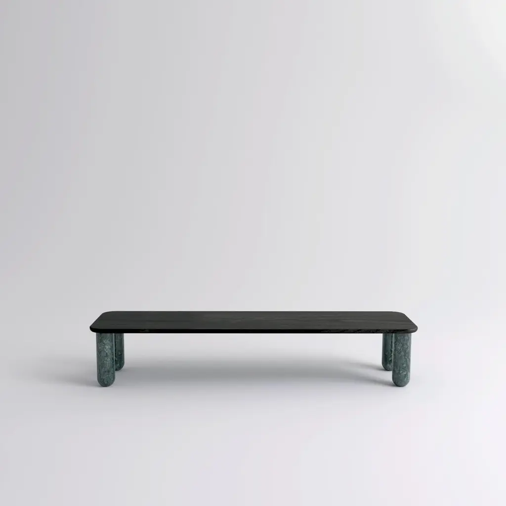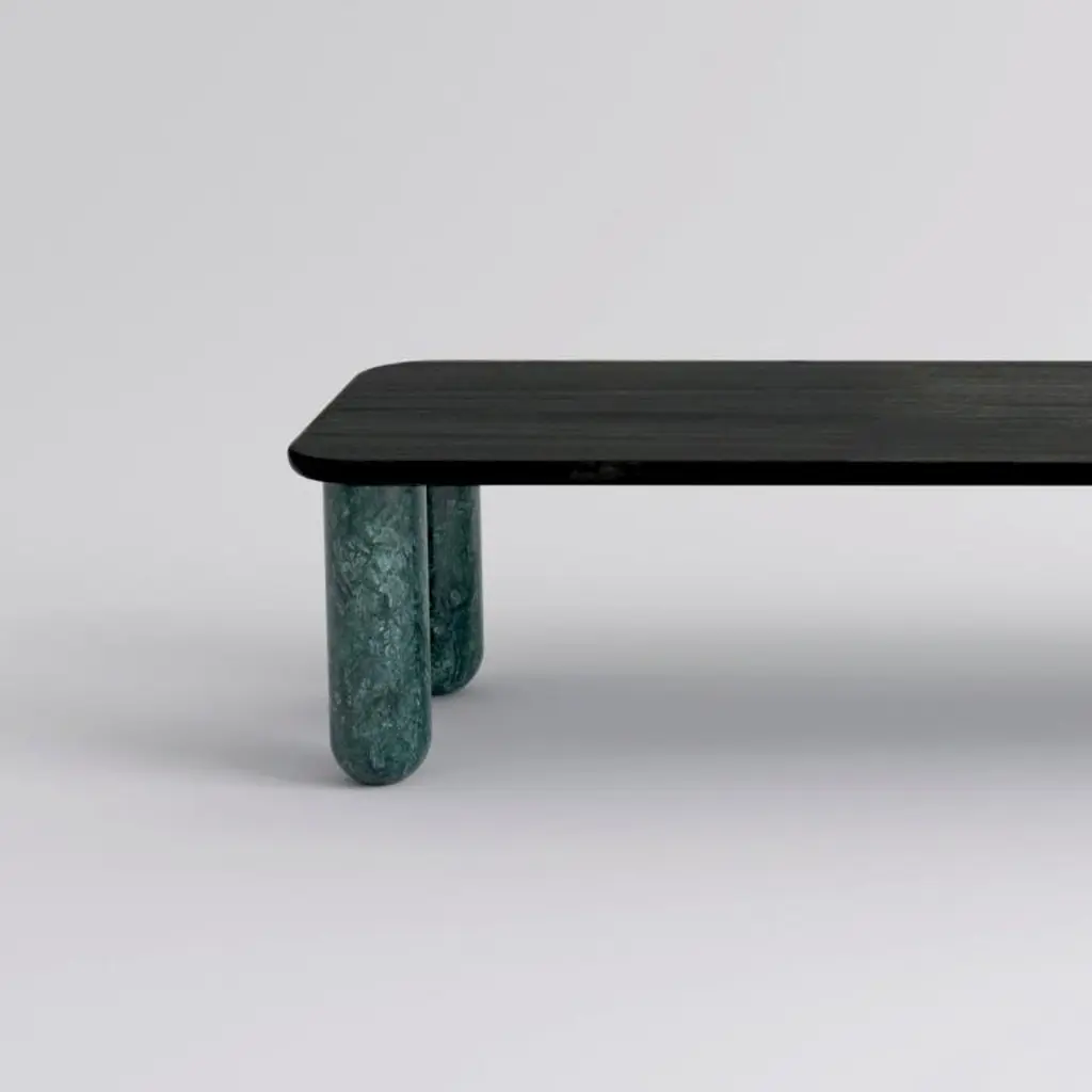 Large black wood and green marble "Sunday" coffee table, Jean-Baptiste SouletieDimensions: 50 W x 200 D x 35 H cmMaterials: Indian Green marble legs, black stained wood top.Available in 4 sizes: D150, W50 / D200, W50 / D150, W100 / D200, W100.Available in 5 top materials: walnut / black stained wood / Pele de Tigre marble / Black Marquina marble / Indian green marble.Available in 3 leg materials: Pele de Tigre marble / Black Marquina marble / Indian green marble.Sunday is a family of coffee tables and low consoles with a simple and clean design vocabulary. The combination of heavy marble legs with the thin solid wood or marble top creates an interesting contrast while the rounded edges and generous proportions provide a comforting feeling.Jean-Baptiste Souletie is the Co-founder of the furniture editor La Chance with Louise Breguet. He studied in India, worked for a merchant bank in London (where he designed their new offices), before working for an investment fund (where he redevised the graphic chart), and in the strategic department of a luxury goods company in Paris. He returned to his first loves, architecture and furniture, when he founded La Chance in 2012.