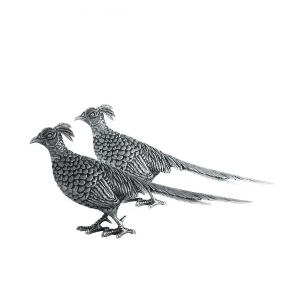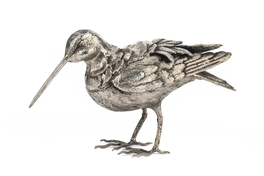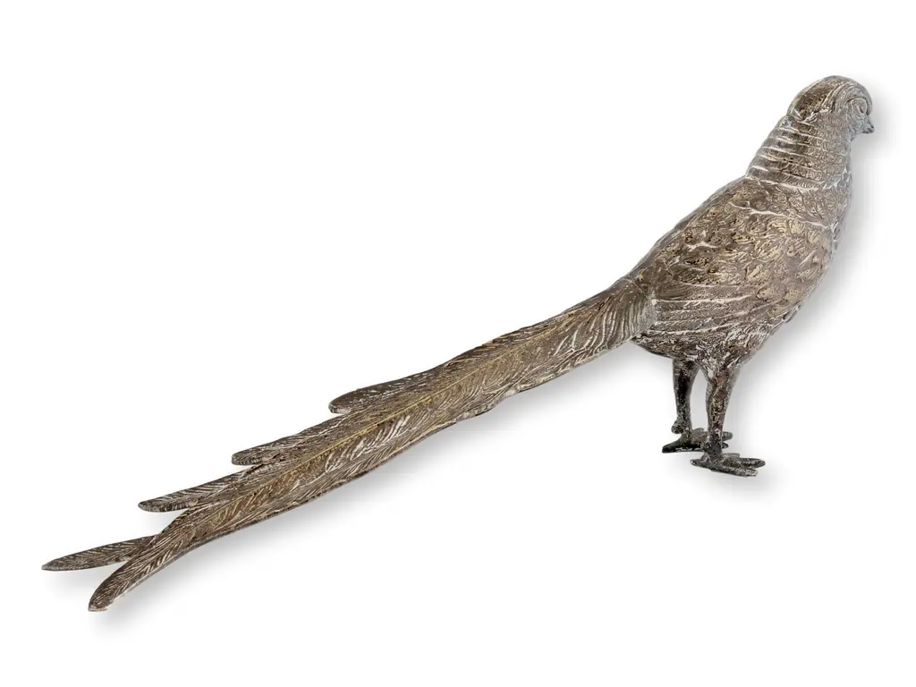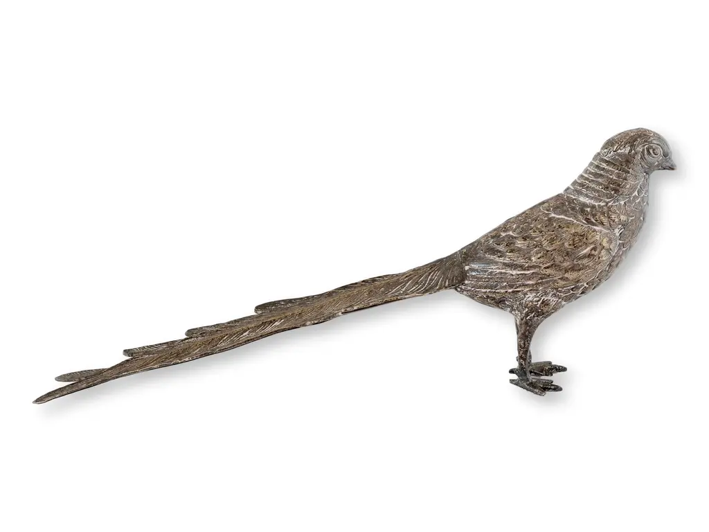 Popular from the late 19th to early 20th century, this French table ornament depicts a pheasant in silvered metal with intricate feather detail and a long sweeping tail. A striking centerpiece reflecting classic country house style and Art Deco elegance. Perfect for collectors of antique animalier sculptures or refined decorative accents. No marks.