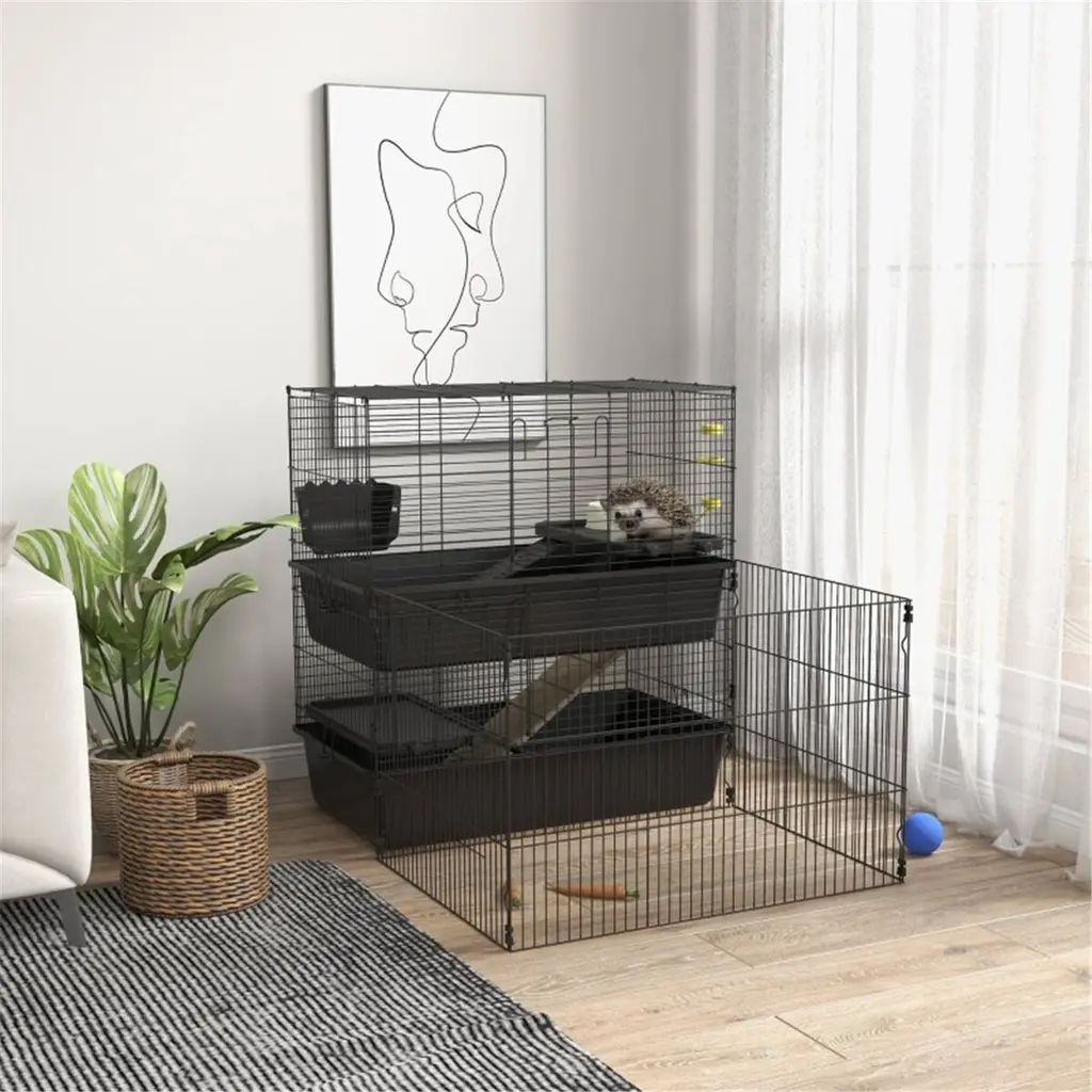 Large Hamster Cage, 3-Tier Gerbil Cages With Running Wheel, Portable Hamster House With 7" Deep Glass Bottom - Black - Black