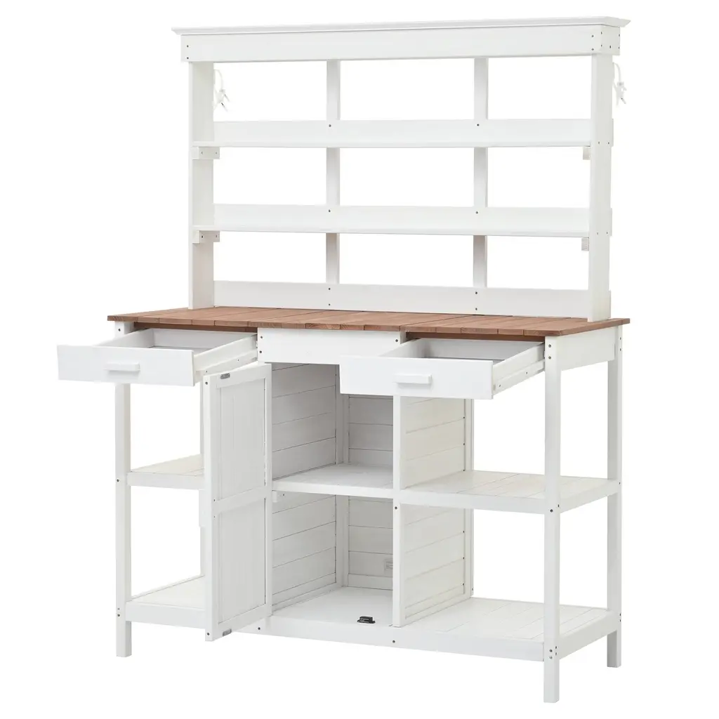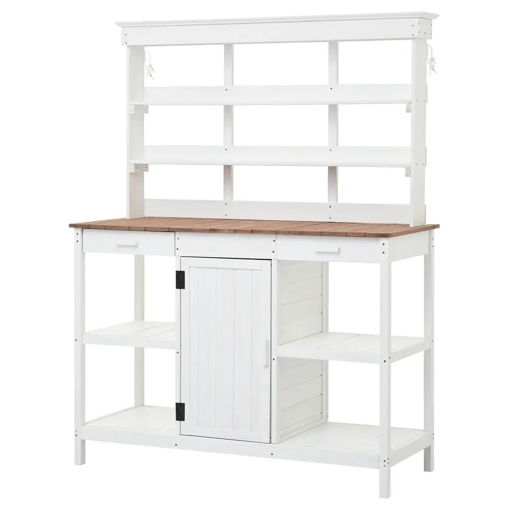 Large Outdoor Farmhouse Wooden Potting Bench Table, Garden Workstation With 2 Drawers, Cabinet And Open Shelves For Backyard - Off-White