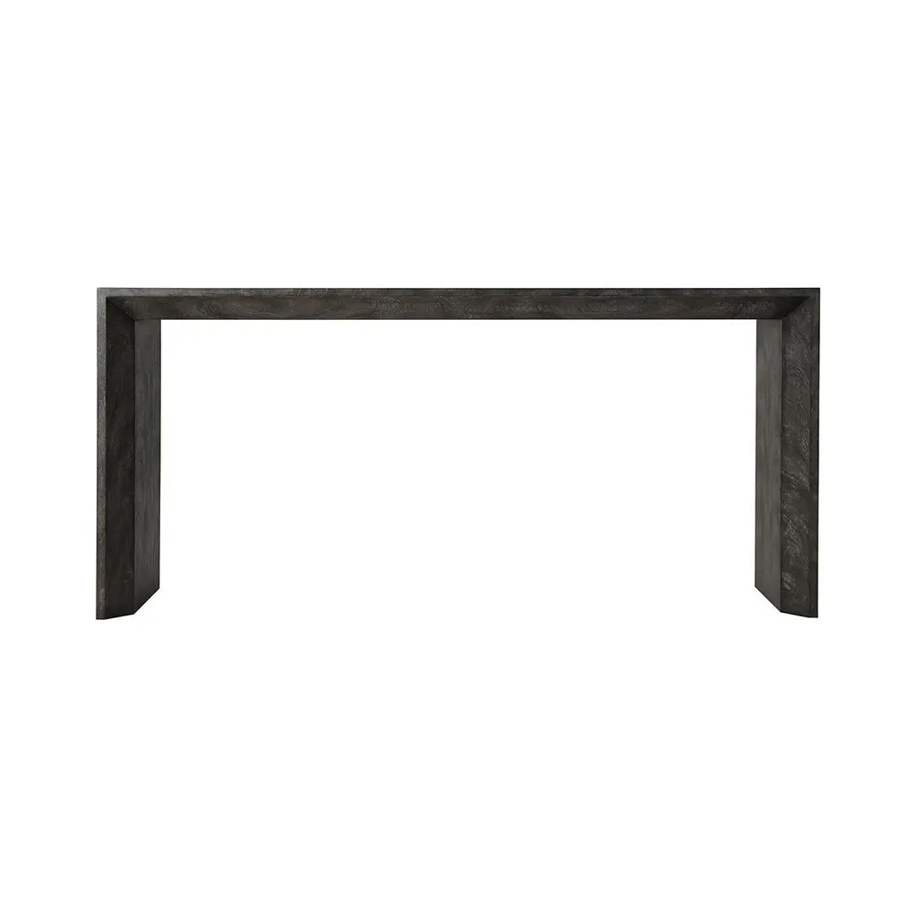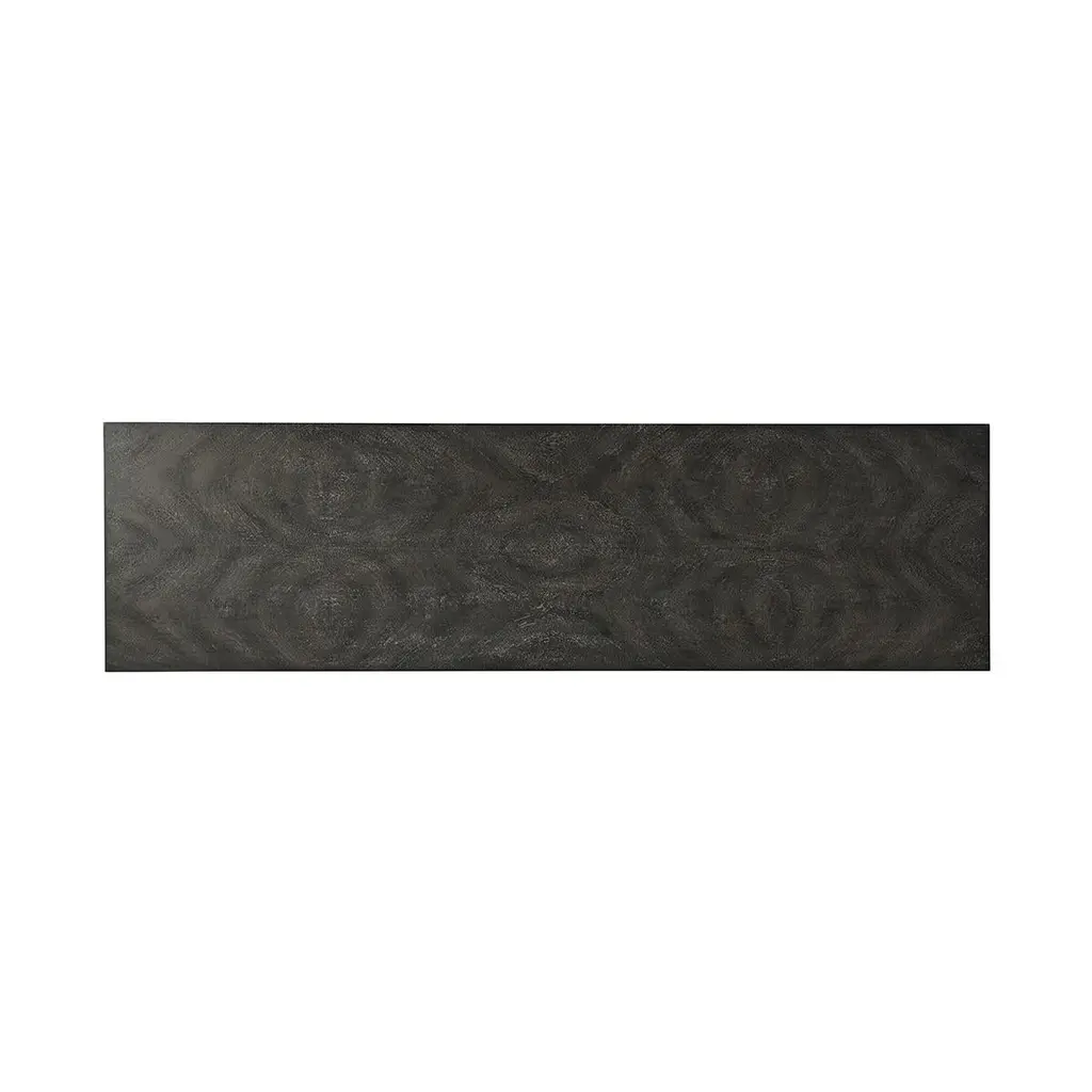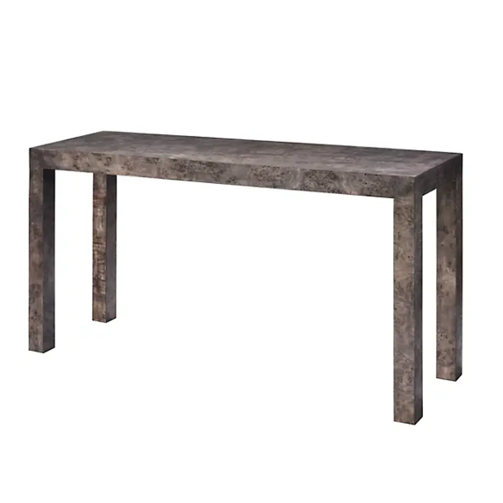 a stylish and functional addition to any living space. This sleek and versatile table is designed to enhance the aesthetic appeal of your home while providing practical display options.Crafted with meticulous attention to detail, the console table features a clean and contemporary design. The rectangular tabletop has a smooth surface, in our Ember finish on random parquetry swirl veneers, with a beveled edge, offering a perfect canvas to add a touch of personal style to your space.Dimensions: 65" W x 18" D x 32" H