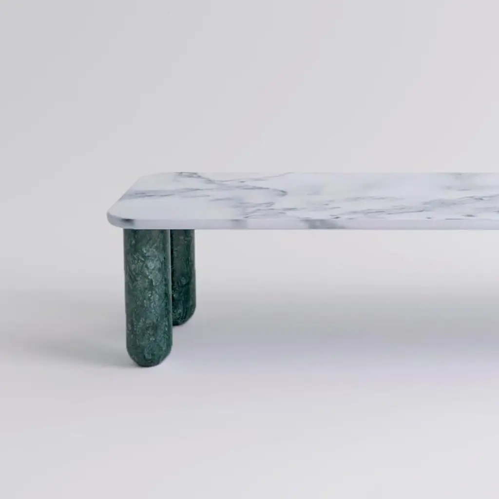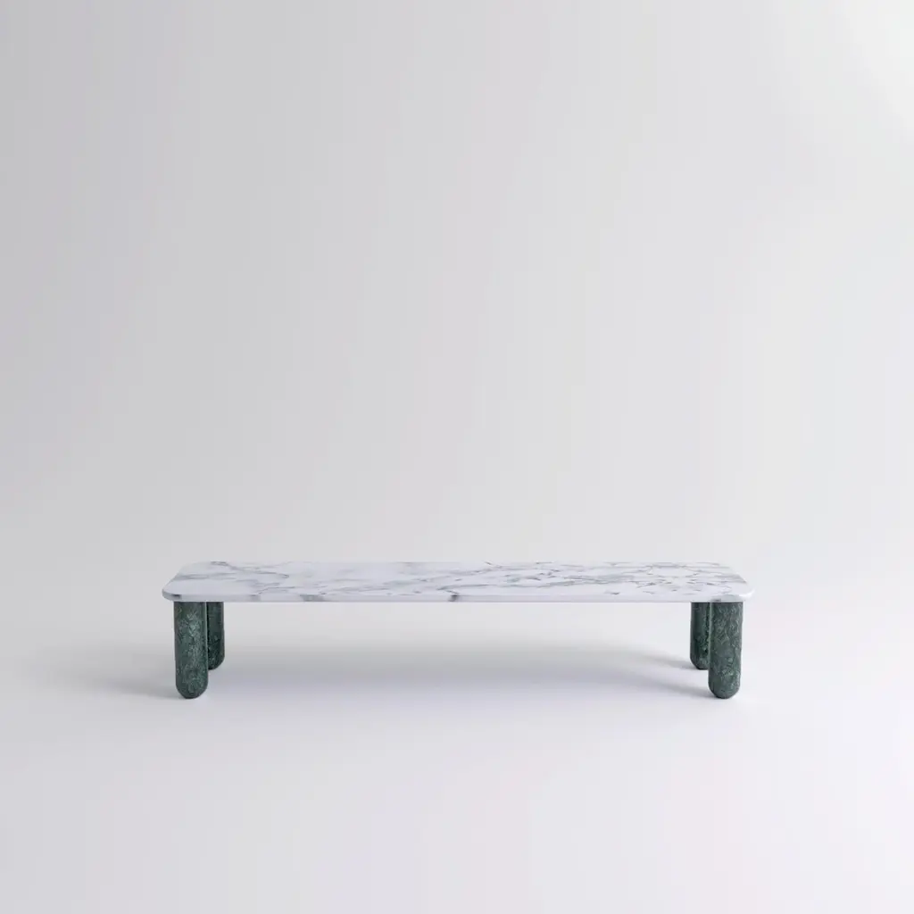 Large white and green marble "Sunday" coffee table, Jean-Baptiste Souletie.Dimensions: 50 W x 200 D x 35 H cm.Materials: Indian green marble legs, Pele de tigre marble top.Available in 4 sizes: D 150, W 50 / D 200, W 50 / D 150, W 100 / D 200, W 100.Available in 5 top materials: walnut / black stained wood / pele de tigre marble / black marquina marble / Indian green marble.Available in 3 leg materials: Pele de Tigre marble / black Marquina marble / Indian green marble.Sunday is a family of coffee tables and low consoles with a simple and clean design vocabulary. The combination of heavy marble legs with the thin solid wood or marble top creates an interesting contrast while the rounded edges and generous proportions provide a comforting feeling.Jean-Baptiste Souletie is the co-founder of the furniture editor La Chance with Louise Breguet. He studied in India, worked for a merchant bank in London (where he designed their new offices), before working for an investment fund (where he redevised the graphic chart), and in the strategic department of a luxury goods company in Paris. He returned to his first loves, architecture and furniture, when he founded La Chance in 2012.
