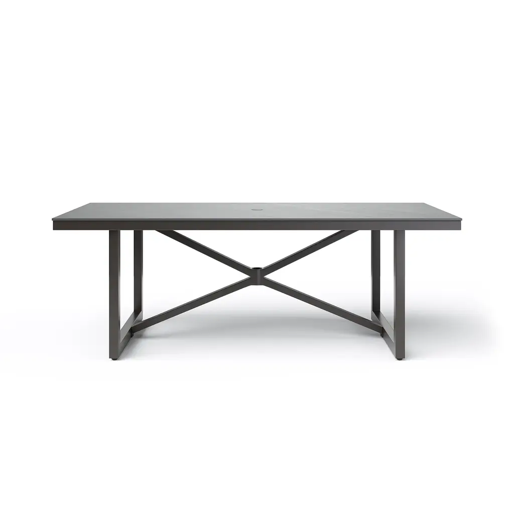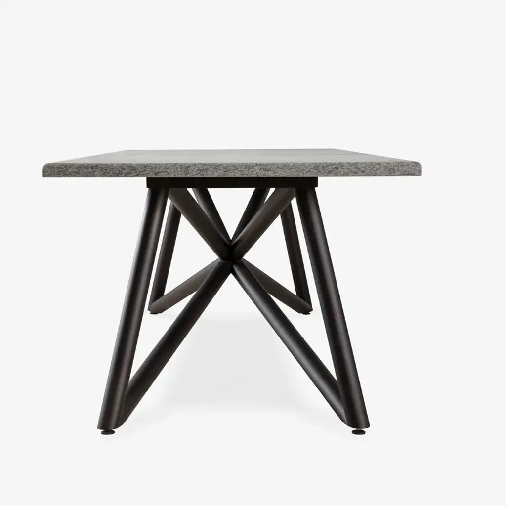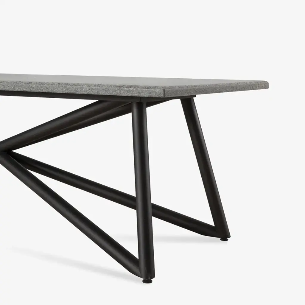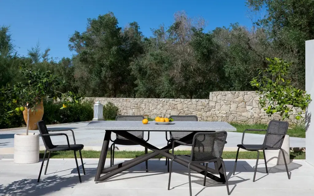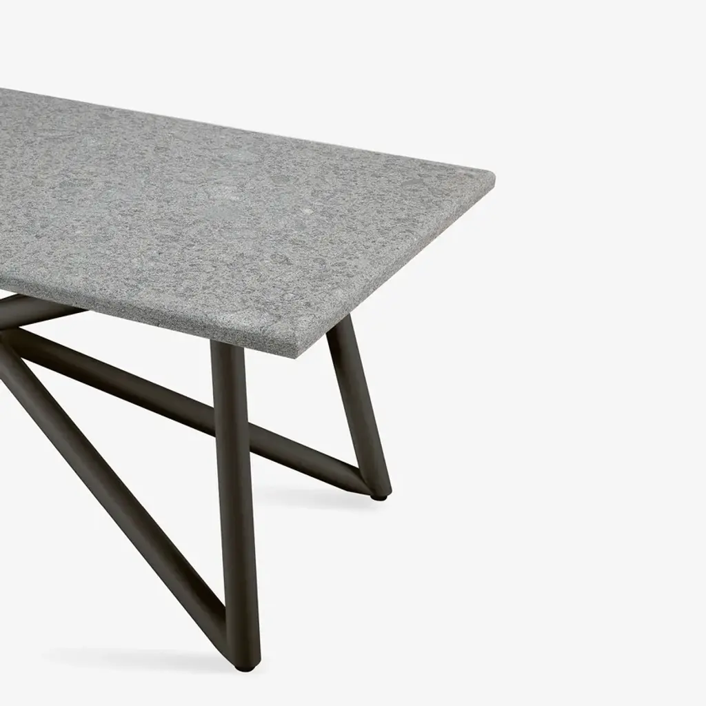 Larte is a rectangular table featuring a peperino, travertine, or marble top and a crisscrossed metal base, providing perfect support and structure to the natural stone surface. Elegant and simple, it blends design and functionality, imparting a distinctive atmosphere to any space. The seating options paired with the LARTE table share the same finishes as the base, ensuring the possibility of choosing coordinated furnishings.Table top: a single rectangular top measuring 200X 100 X 4 cm (length, width, thickness). Table base: Intertwined galvanized steel tubes, dark brown, powder-coated with thermosetting powders for outdoor use. Base measurement cm: 175.7 x 75.7 x 71 Stone: Pepperino, smoothed natural stone treated with stain and rain-resistant products. Details: the edge has a rounded finish.Cutting and welding with state-of-the-art numerically controlled work tools.