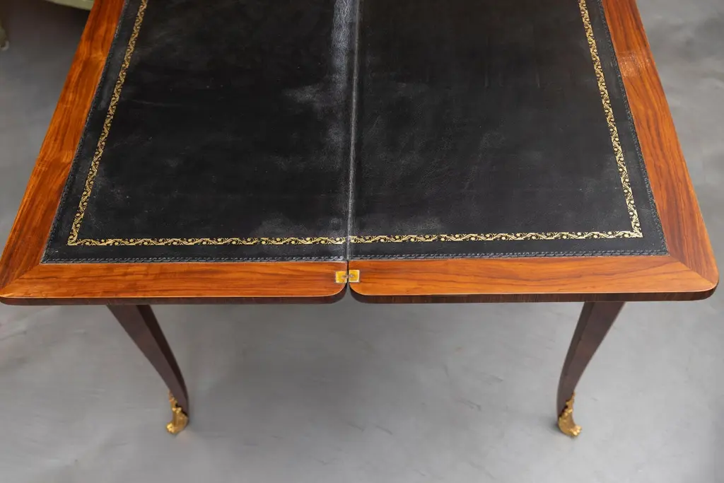 This is a classic pair of late 19th century mahogany and king wood Louis XV style inlaid game tables with the top opening to reveal a leather-inset, supported by graceful slender cabriole legs with ormolu mounts. Pair available, priced individually.