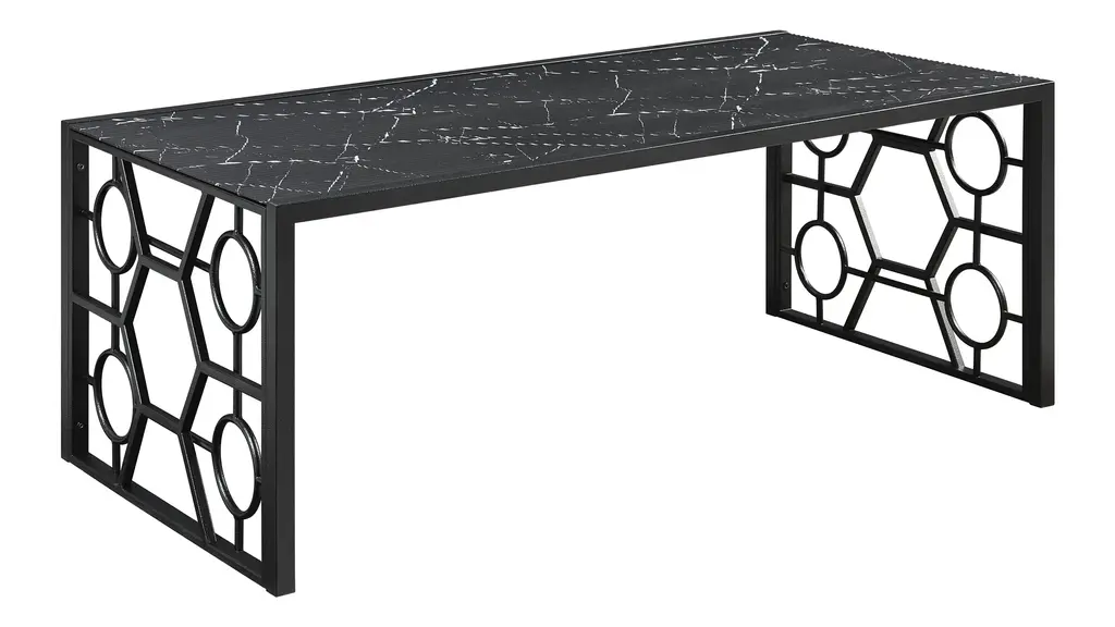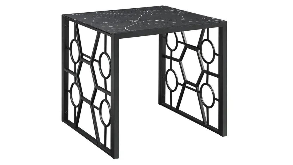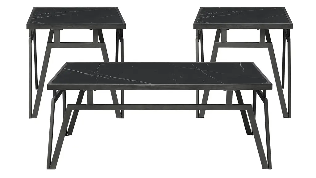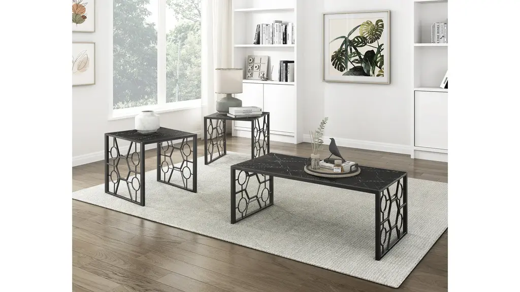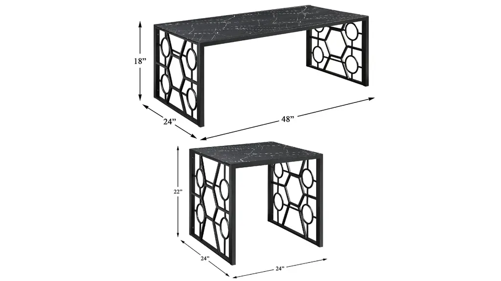Lavi 3-piece occasional table set is featuring a marble print tempered fluted glass top and a sturdy black metal base, each table showcases a striking geometric pattern on the sides, bringing a stylish and contemporary aesthetic to any room. This unique design element, combined with the sleek finishes, makes it perfect for modern homes, blending functionality with eye-catching detail.