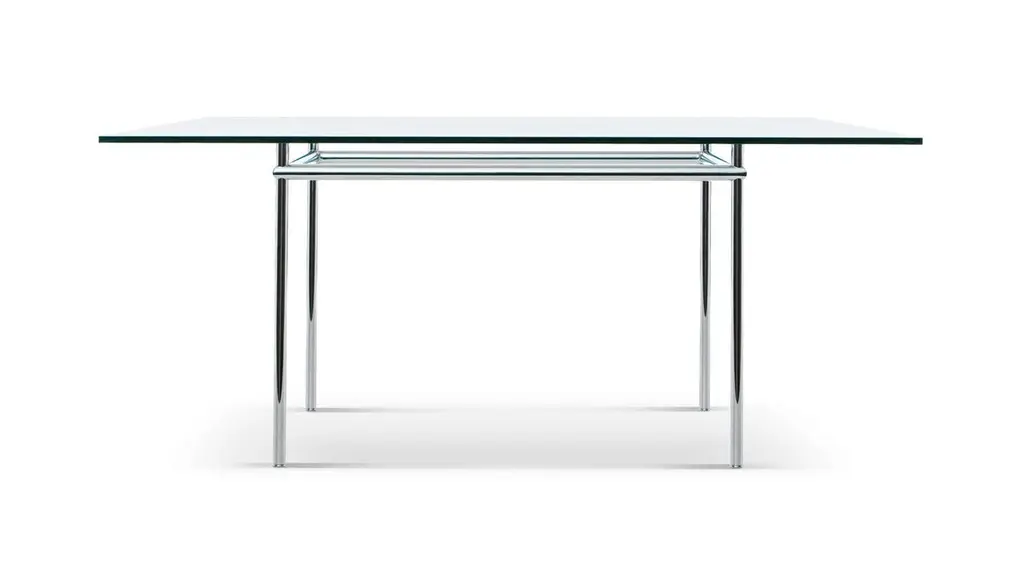 Price is dependent on the chosen size and materials. Available in 120 X 80 OR 160 X 120. The Top is available in American Walnut, Natural Oak or Black stained Oak. The metal base is available in chrome or light blue. Table designed by Le Corbusier, Pierre Jeanneret, Charlotte Perriand in 1935. Relaunched by Cassina in 1985. Manufactured by Cassina in Italy.