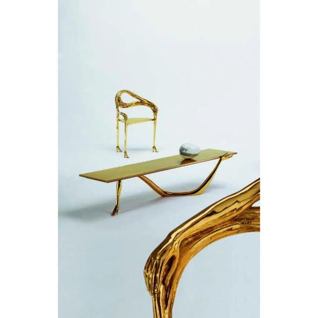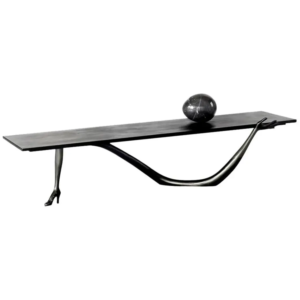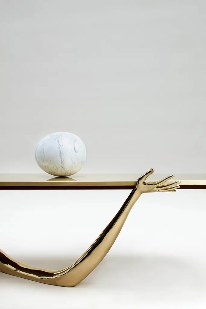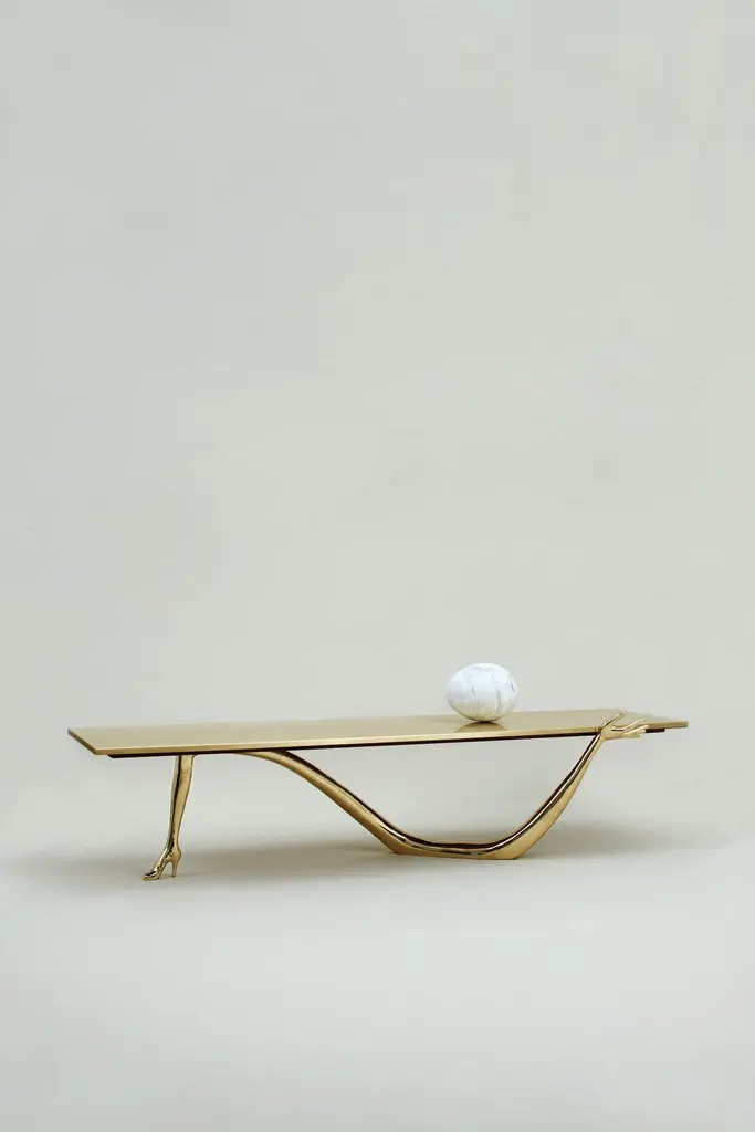 Leda low table, Salvador Dalí Design inspired on an artwork by Salvador DalíDimensions: 51 x 190 x 61 H cmMaterials: brass, marbleDesign inspired on an artwork by Salvador Dalí: ‘Femme à tête de roses’ (1935). Legs in cast varnished brass or black patina not varnished (Black Label).Tabletop in brushed and varnished brass or black patina (Black Label). Carrara marble egg on top or Nero Marquina marble egg (Black Label). BDB