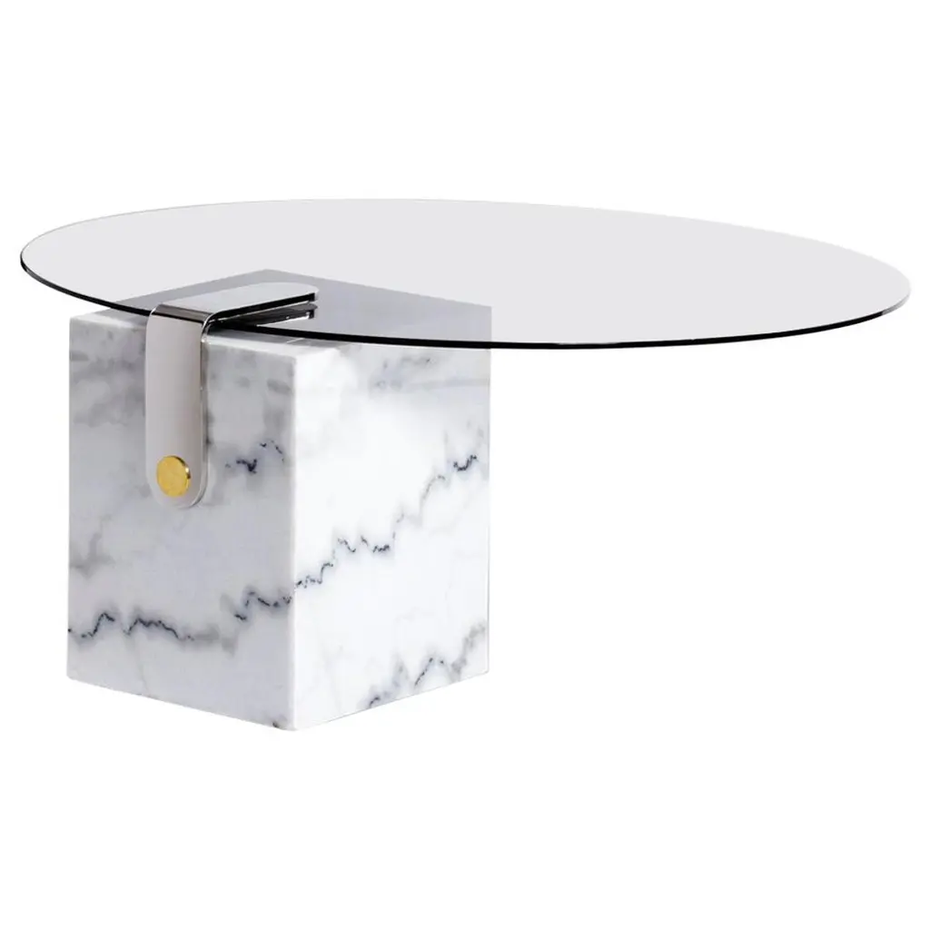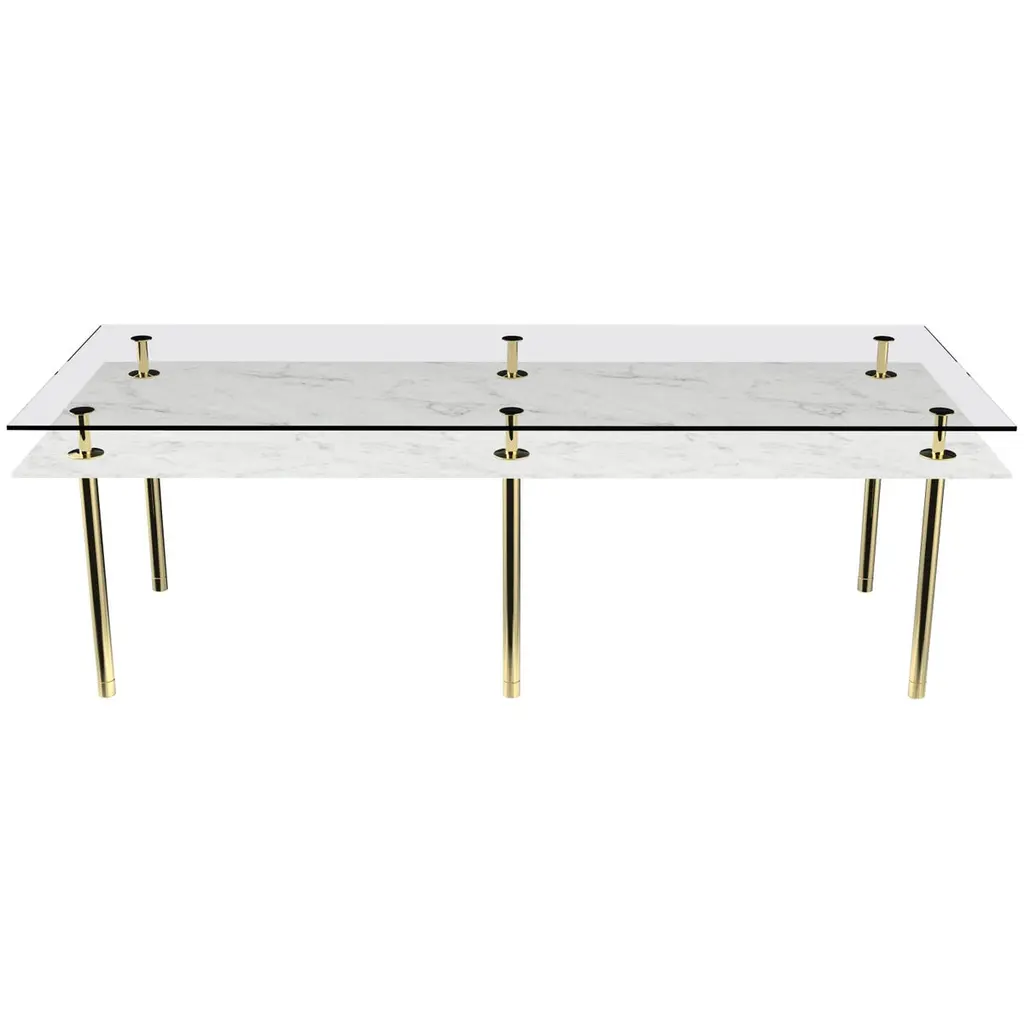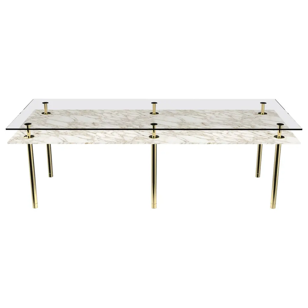Table in crystal and brass. The designer imagines a turning point in the use of such a precious finishes such as polished brass: from the idea of almost a unique object in its perfect craftsmanship, to the system to be built starting from the base.A column made of brass whose different diameters define base and capital, just as the columns of classic architecture. The column multiplies to infinity, is interrupted and then resumed to hold glass tops, wood or marble and configure even angular shelves, tables, small tables, displays and consoles. A landscape of almost infinite possibilities that designers and end users can chose from to organize the space both in domestic and contract situations, maintaining aesthetic uniformity in the name of a more refined elegance.Structure: Solid brass legs lacquered diameter 45mm.Top Finishes: 12mm glass, 30mm wood.Additional Information:Material: Brass, calacatta gold marbleFinish: Polished brassTop: Calacatta gold marbleDimensions: W 150 x D 75 x H 35 cmAvailable in other shape options: Round and squareAvailable in other size options: LargeAvailable in other wood top finish option: Striped oak, canaletto walnut, bolivar, new lime, caleido, mahoganyAvailable in other marble top options: Carrara white, emperador dark, sahara noir, eramosa brownAvailable in other finish options: Satin brass, light burnished brass, brown burnished brass, dark burnished brass, black gold