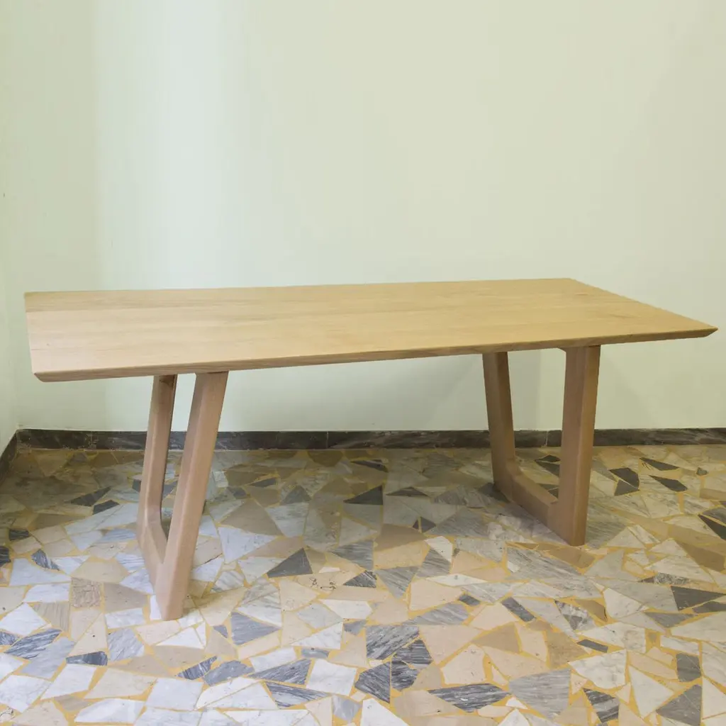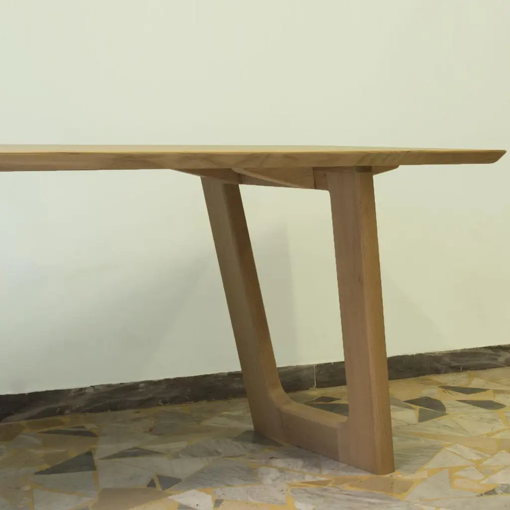Equally at home in contemporary and traditional interior decor, this linear table features flawless angles and a subtle sheen made with a clear ecological water-based paint and hand-polished beeswax polish. The frame combines two prized essences, chestnut for the rectangular top with 45 degree-trimmed edges and solid maple for the sturdy geometric base with two legs slightly tilted outwards. Fully customizable upon request, this table comes entirely disassembled with detailed instructions for easy and quick assembly.