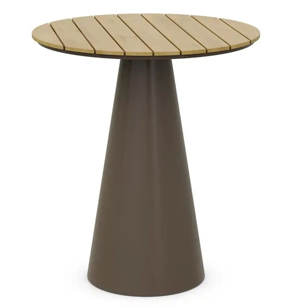 The Leon Outdoor Alpine Weather Wood Bar/Counter Table from Azzurro Living unites durability and design together for easygoing outdoor gatherings. Its broad, slatted, disc-shaped top is made from Dekton porcelain or engineered WeatherWood—a high-density polyethylene wood that resists cracking, mildew, rot, and UV damage. A large conical base in powder-coated aluminum offers sturdy support and a bold silhouette. Engineered for commercial-grade performance, it can also excel in residential settings, as it’s water-, stain-, and rust-resistant, offering long afternoons and low-maintenance living.