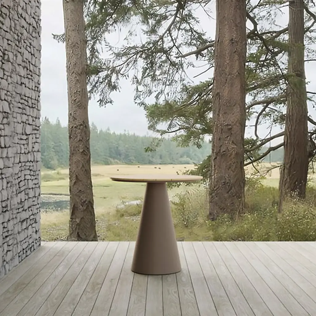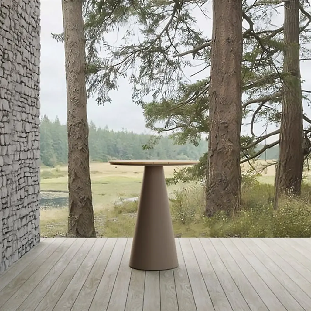 The Leon Outdoor Alpine Weather Wood Bar/Counter Table from Azzurro Living unites durability and design together for easygoing outdoor gatherings. Its broad, slatted, disc-shaped top is made from Dekton porcelain or engineered WeatherWood—a high-density polyethylene wood that resists cracking, mildew, rot, and UV damage. A large conical base in powder-coated aluminum offers sturdy support and a bold silhouette. Engineered for commercial-grade performance, it can also excel in residential settings, as it’s water-, stain-, and rust-resistant, offering long afternoons and low-maintenance living.
