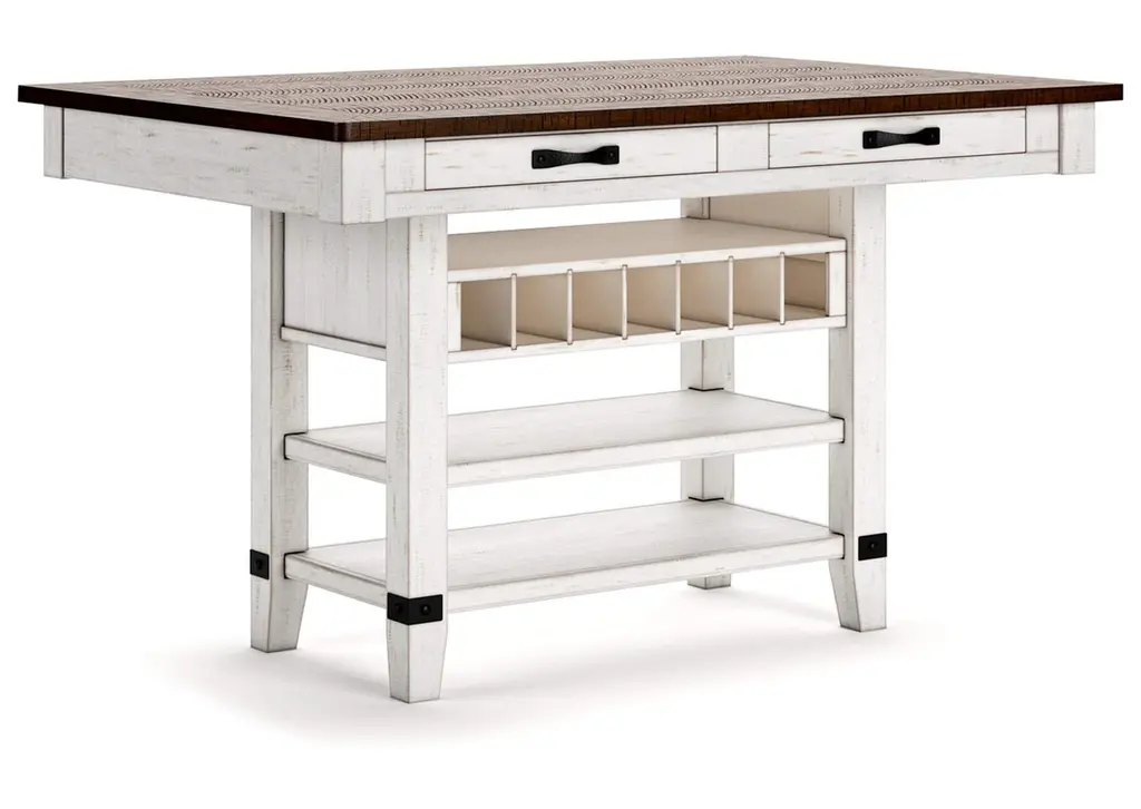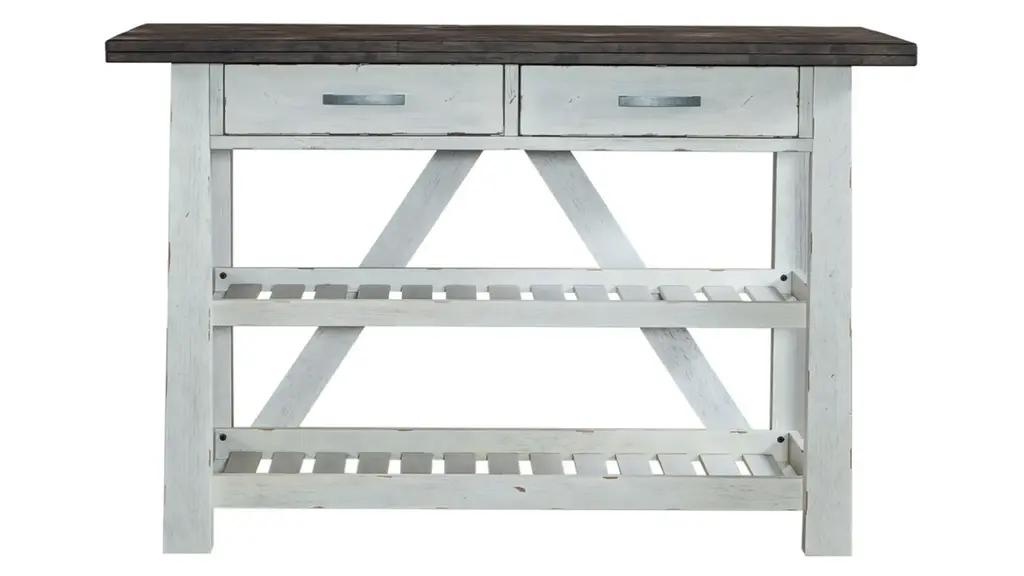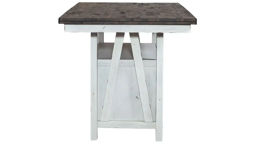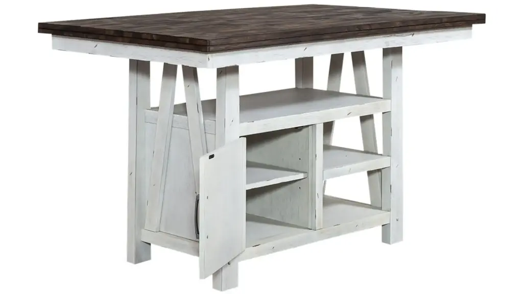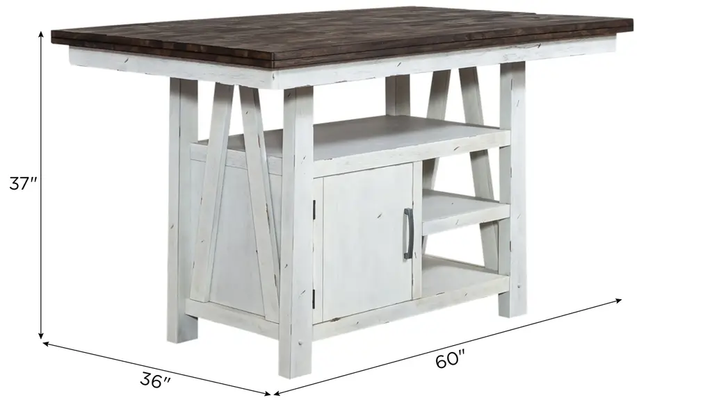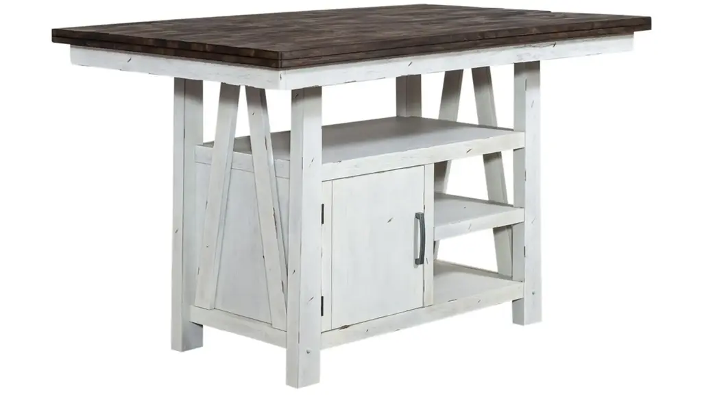 Liberty Gathering Table features a timeless heavy distressing, one adjustable shelf hidden behind the doors, a solid wood tabletop, pewter pull hardware, magnetic door catches, and two smaller open shelves for additional storage or to display items. The two-tone white finish with wood tone top creates a versatile look that is sure to be the perfect addition to any space.