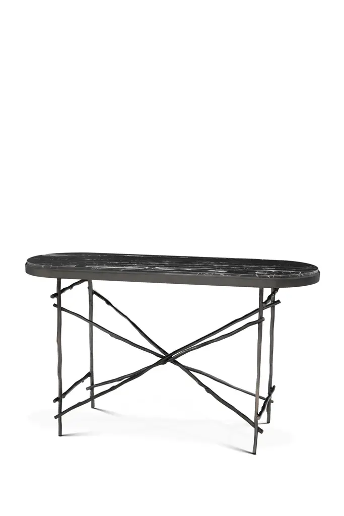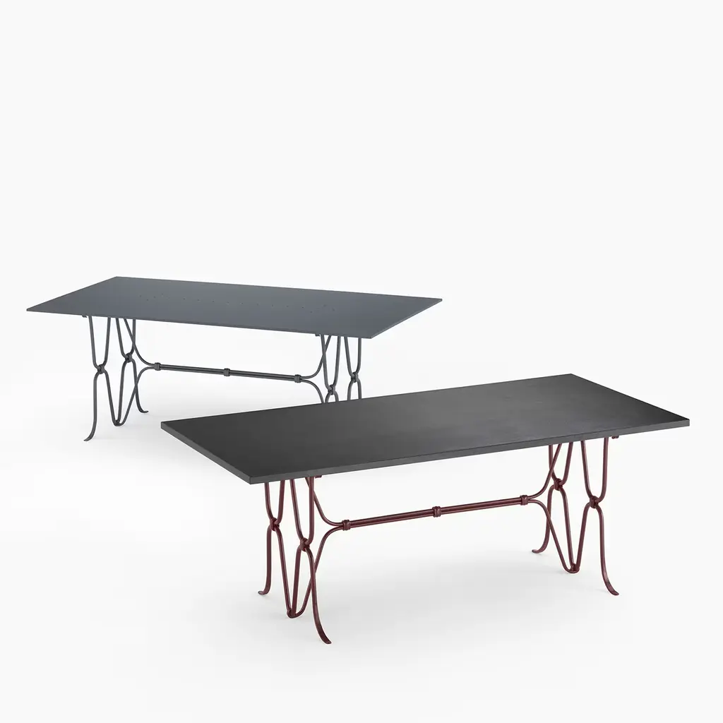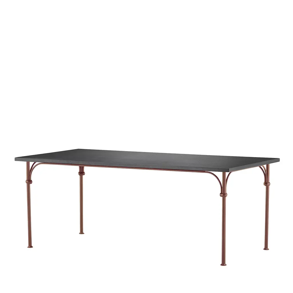 Dramatic curves distributed according to a repetitive scheme at once, emphasizing and softening their rhythm, immediately characterize this table as a piece of refined sculptural impact. Dynamic and airy, the galvanized metal base is sealed by a brown powder coating and surmounted by a wide rectangular top in authentic lava stone. Please contact the Concierge for available color variants.