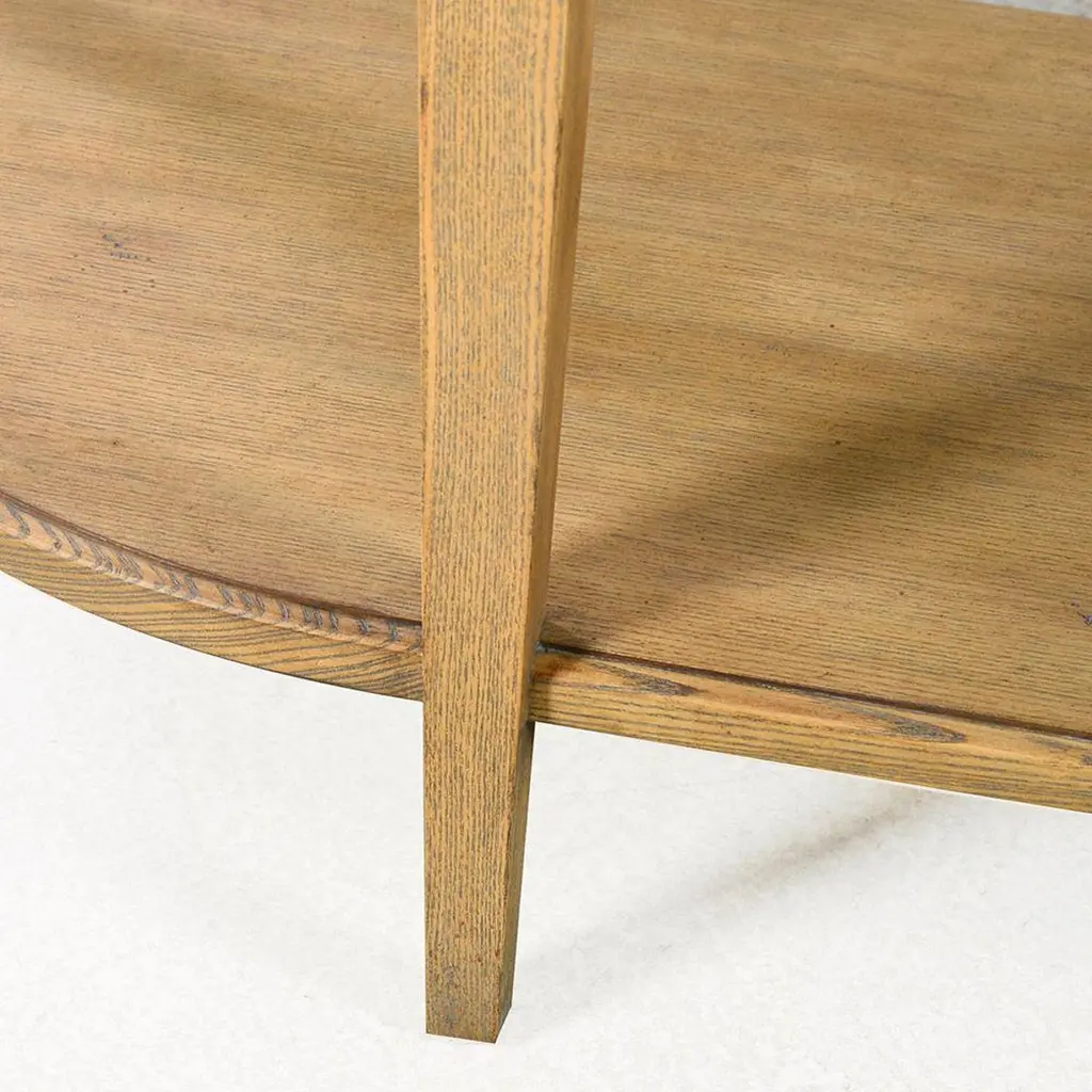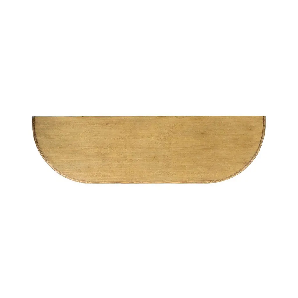 The demi-lune silhouette is accentuated by a molded edge top and apron, showcasing graceful curves with classical inspiration. Square tapered legs support the design while the integrated stretcher shelf offers practical storage and balance to the overall composition.Crafted in a warm, natural finish, this console table blends seamlessly with both traditional and transitional interiors. Whether styled with décor accents or used as a display base, its sculpted form and craftsmanship elevate the space with quiet sophistication.Dimensions: 64" W x 18" D x 32.5" H