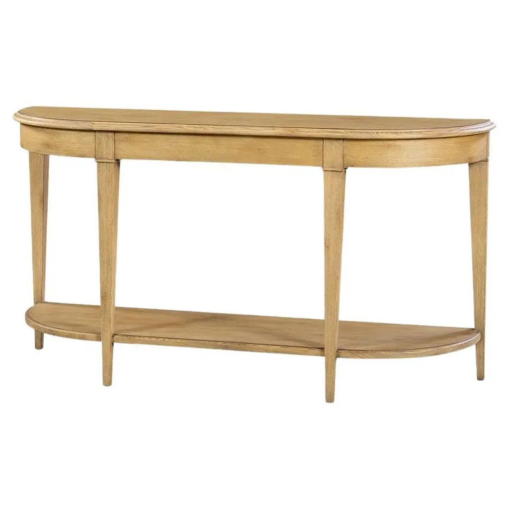 The demi-lune silhouette is accentuated by a molded edge top and apron, showcasing graceful curves with classical inspiration. Square tapered legs support the design while the integrated stretcher shelf offers practical storage and balance to the overall composition. Crafted in a warm, natural finish, this console table blends seamlessly with both traditional and transitional interiors. Whether styled with décor accents or used as a display base, its sculpted form and craftsmanship elevate the space with quiet sophistication. Dimensions: 64" W x 18" D x 32.5" H