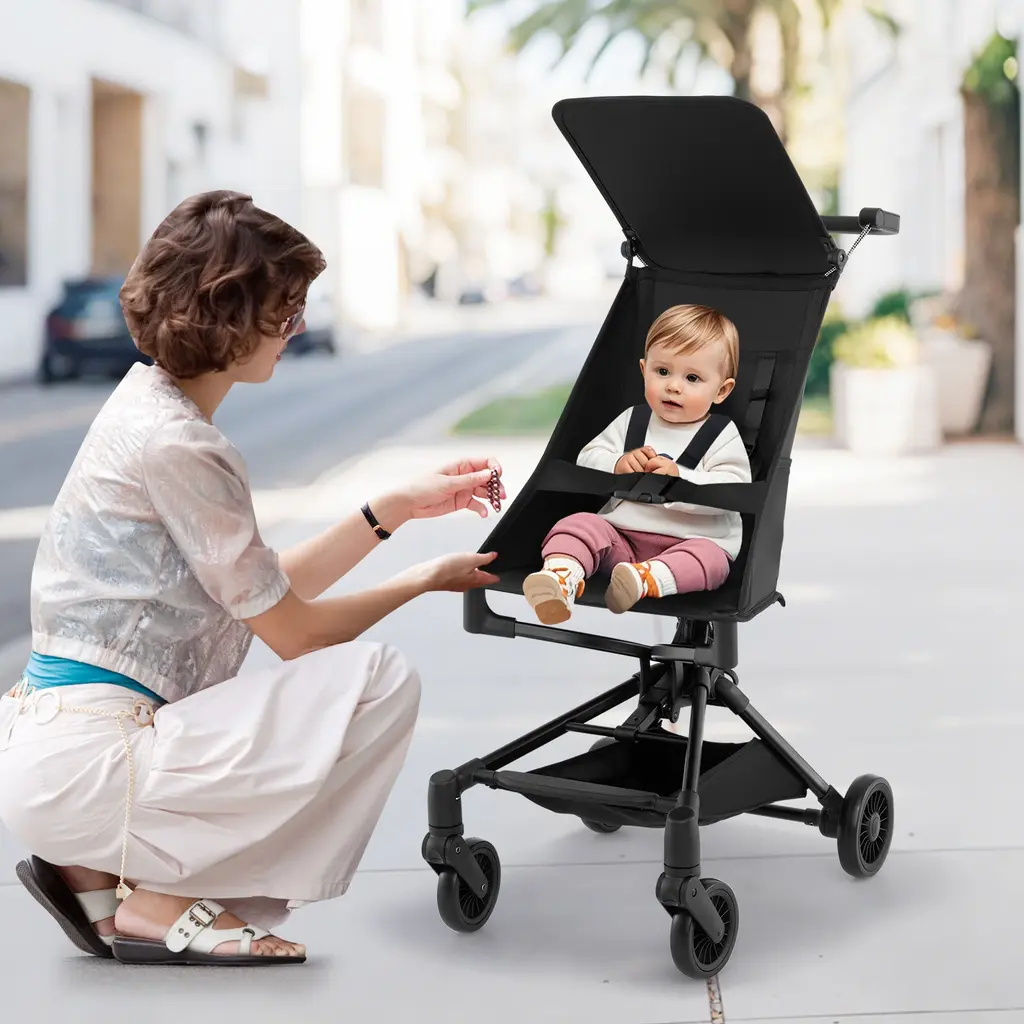 Specifications:Key Features:● Ultra Lightweight Design: Weighing in at just 11 lbs, this lightweight baby stroller is easy for parents to carry with a built-in carry handle. This design simplifies your outings without sacrificing comfort or durability, ensuring you and your baby enjoy each outing with ease. And heavy-duty frame makes it safe and reliable.● Compact Folding Stroller: To fold this baby stroller, just release the latch, press the buttons, and push forward while pressing down. The compact folding size not only allows for space-saving storage, but also makes the stroller perfectly sized for airplane overhead compartments, ensuring it is your convenient travel companion.● All-Terrain EVA Wheels: The all-terrain EVA wheels are wear-resistant, anti-skid and puncture-proof, enabling this infant stroller to traverse well on speed bumps, cobbled roads, grasslands or sand. The shock absorbers on front wheels and one-step brake on rear wheels offer a safe and cozy ride for babies.● Friendly for Babies & Parents: Prioritizing comfort and safety, this travel stroller features a hammock type seat with double safety protection (safety guardrail and adjustable safety harness) and an adjustable and detachable oxford fabric canopy. For parents, a large storage basket and an easy-to-grip push handle enhance convenience.● Reliable & Safe Construction: Built to last, the foldable stroller is made with tear-resistant oxford fabric and a heavy-duty frame. serving as a reliable choice for babies from 6 to 36 months old and bringing parents peace of mind.