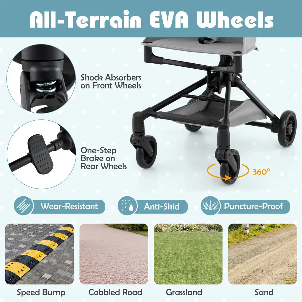 Specifications:Key Features:● Ultra Lightweight Design: Weighing in at just 11 lbs, this lightweight baby stroller is easy for parents to carry with a built-in carry handle. This design simplifies your outings without sacrificing comfort or durability, ensuring you and your baby enjoy each outing with ease. And heavy-duty frame makes it safe and reliable.● Compact Folding Stroller: To fold this baby stroller, just release the latch, press the buttons, and push forward while pressing down. The compact folding size not only allows for space-saving storage, but also makes the stroller perfectly sized for airplane overhead compartments, ensuring it is your convenient travel companion.● All-Terrain EVA Wheels: The all-terrain EVA wheels are wear-resistant, anti-skid and puncture-proof, enabling this infant stroller to traverse well on speed bumps, cobbled roads, grasslands or sand. The shock absorbers on front wheels and one-step brake on rear wheels offer a safe and cozy ride for babies.● Friendly for Babies & Parents: Prioritizing comfort and safety, this travel stroller features a hammock type seat with double safety protection (safety guardrail and adjustable safety harness) and an adjustable and detachable oxford fabric canopy. For parents, a large storage basket and an easy-to-grip push handle enhance convenience.● Reliable & Safe Construction: Built to last, the foldable stroller is made with tear-resistant oxford fabric and a heavy-duty frame. serving as a reliable choice for babies from 6 to 36 months old and bringing parents peace of mind.