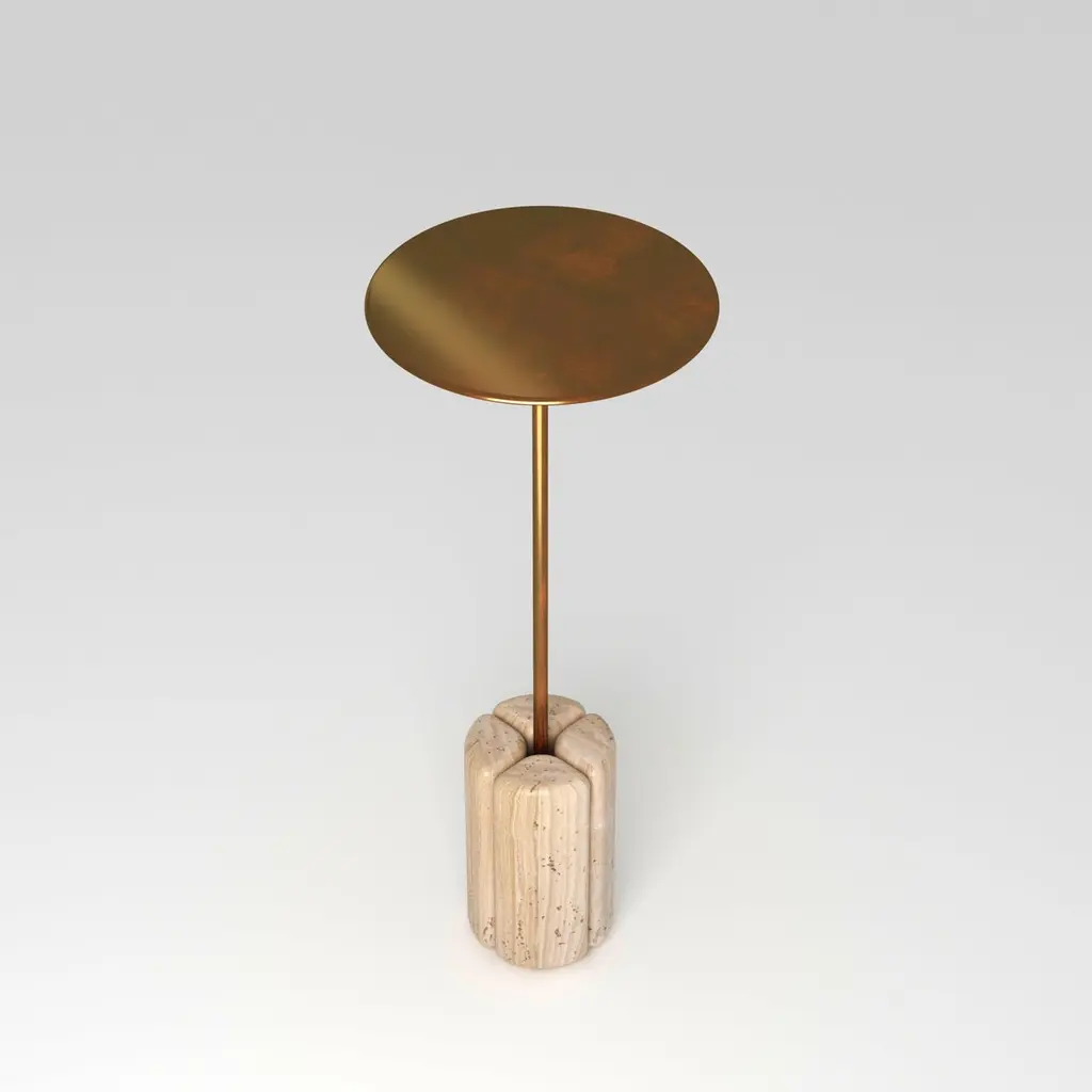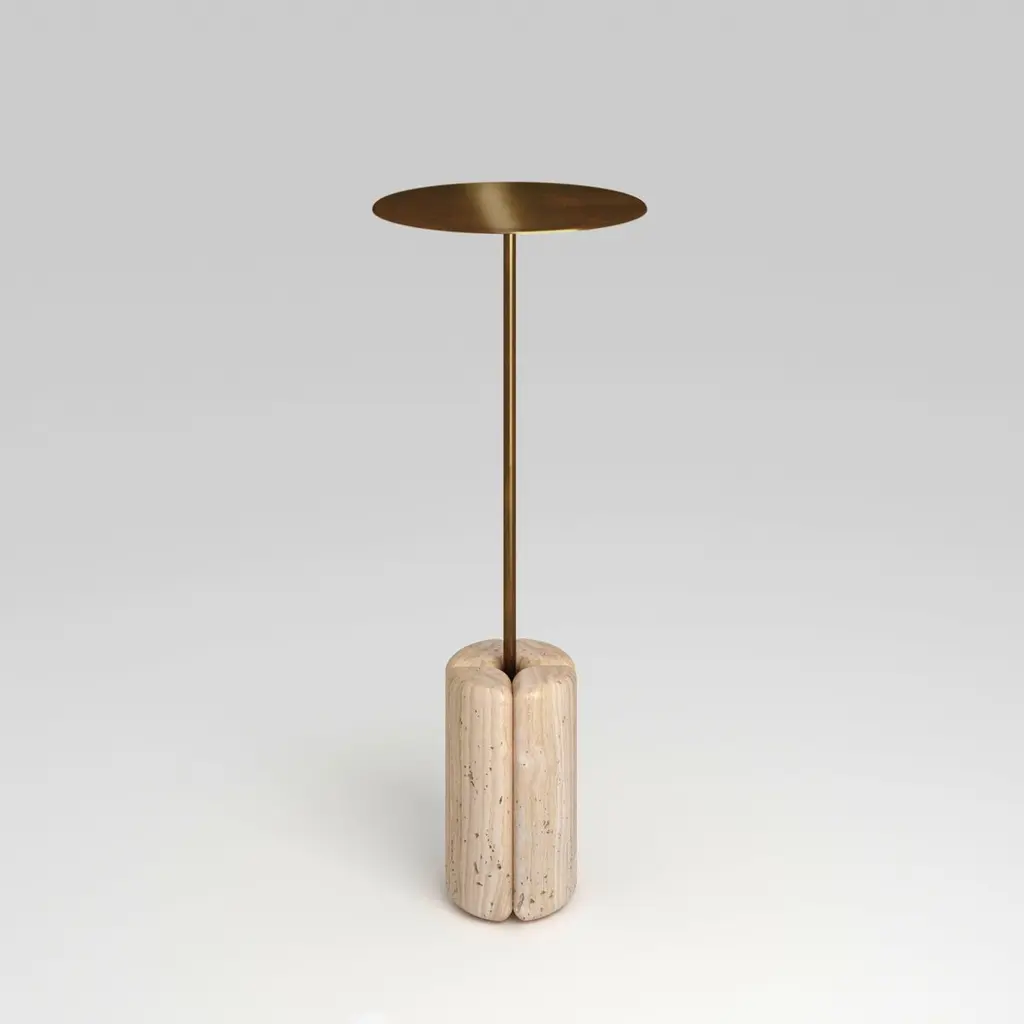 Lily Drink Table by Fred and JuulDimensions: Ø 24 x H 60 cm.Materials: Navona travertine and brass.Fred&Juul, short for Federico Minarelli and Julie Janssen, are two architects who decided to work as architects isn’t for them. It was when designing custom furniture for their clients and developing it with the amazingly skilled local artisans that they truly found joy in their work. So, in 2012 they decided to focus solely on that and launched their first lighting and furniture collection. With the exception of the renovation of the old Tuscan farmhouse that would become their home and studio, a labor of sorrow, but mostly love (see the result on the press page!).What sets them apart is how they see and use their materials of choice: bronze, brass, wood, and stone. Their designs value the inherent nature of these materials and how they are meticulously crafted, like the grainy, clouded surface of their Raffaele light in sand-cast brass or the juxtaposed Oak grains in the marquetry of their Maurits table. Starring all these aspects in the story of a piece is what makes it unique and last.Over the years they have increasingly worked with interior designers on custom pieces for high-end projects all over the world, thanks to their attention to detail, refined aesthetic sense and collaboration with the best highly specialized craftsmen Tuscany has to offer.