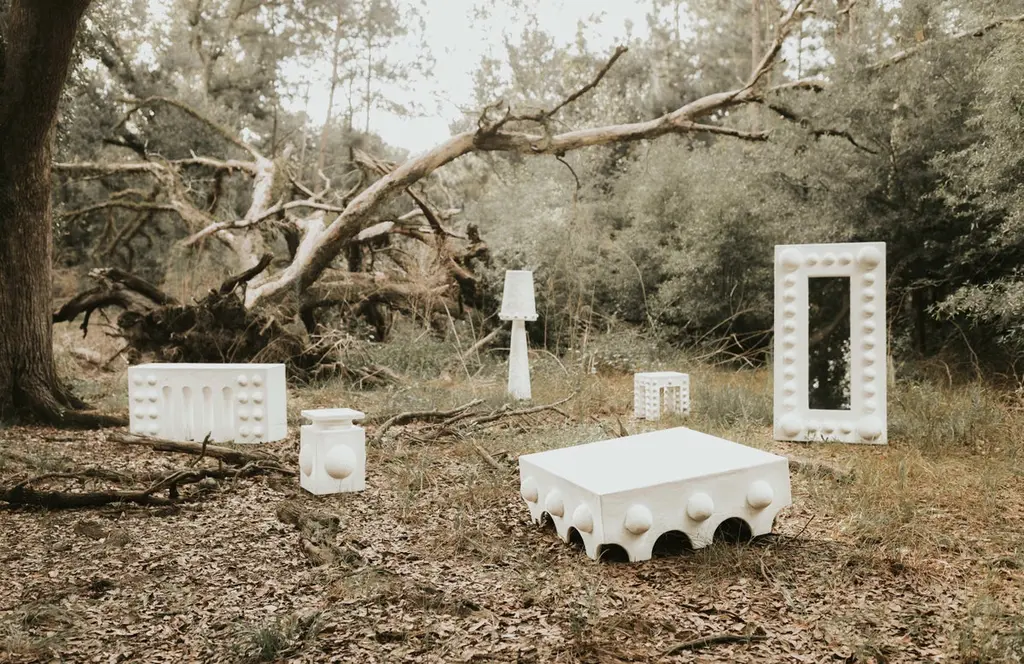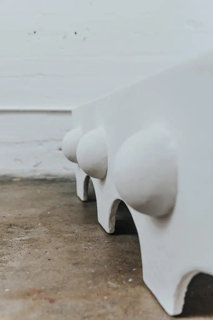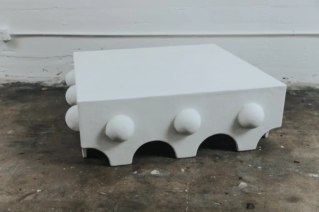 The Linda Coffee Table has a bold architectural presence that can anchor any living room. The oversized piece is covered in a complex plaster and paint mix and adorned with 12 sculptural cast plaster semi-spheres supported by a wooden base structure. Each piece is made to order and is available in white, black, cream, or custom colors. Brent Warr Studios founder Brent Warr was raised in Georgia, USA and studied at Auburn University’s college of Architecture, Design, and Construction. Before moving to the back to Georgia to start his furniture and lighting studio, he moved to NYC to work for esteemed Interior and Architecture firms Meyer Davis Studio and Yabu Pushelberg. Now located in Bainbridge, Georgia, Warr’s furniture, lighting, sculptures, and interiors projects are defined by a studied balance of fluidity and structure, composition and function. His practice is both intuitive and informed by an understanding of history, process, and materials. Above all, Warr’s guiding principles are humor and storytelling. Brent Warr has been featured in Interior Design Magazine, Architectural Digest, Elle Decor, and Vogue Living to name a few.