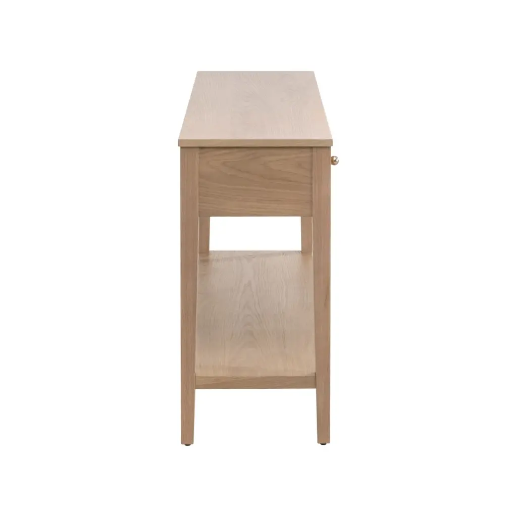 Crafted with a blend of solid oak and oak veneer, this 3-Drawer Console Table offers a transitional style that complements both modern and classic spaces. The finish highlights the beauty of the wood grain, while the fluted wood drawer fronts add dimension and a decorative touch. Each drawer is felt-lined to protect valuables and features iron drawer knobs with a polished brass finish. The piece is constructed with dovetail joinery for enhanced durability as well. Measuring 60" wide, 14.5" deep, and 29.5" high, with three storage drawers and a storage shelf, the table is as practical as it is stylish.