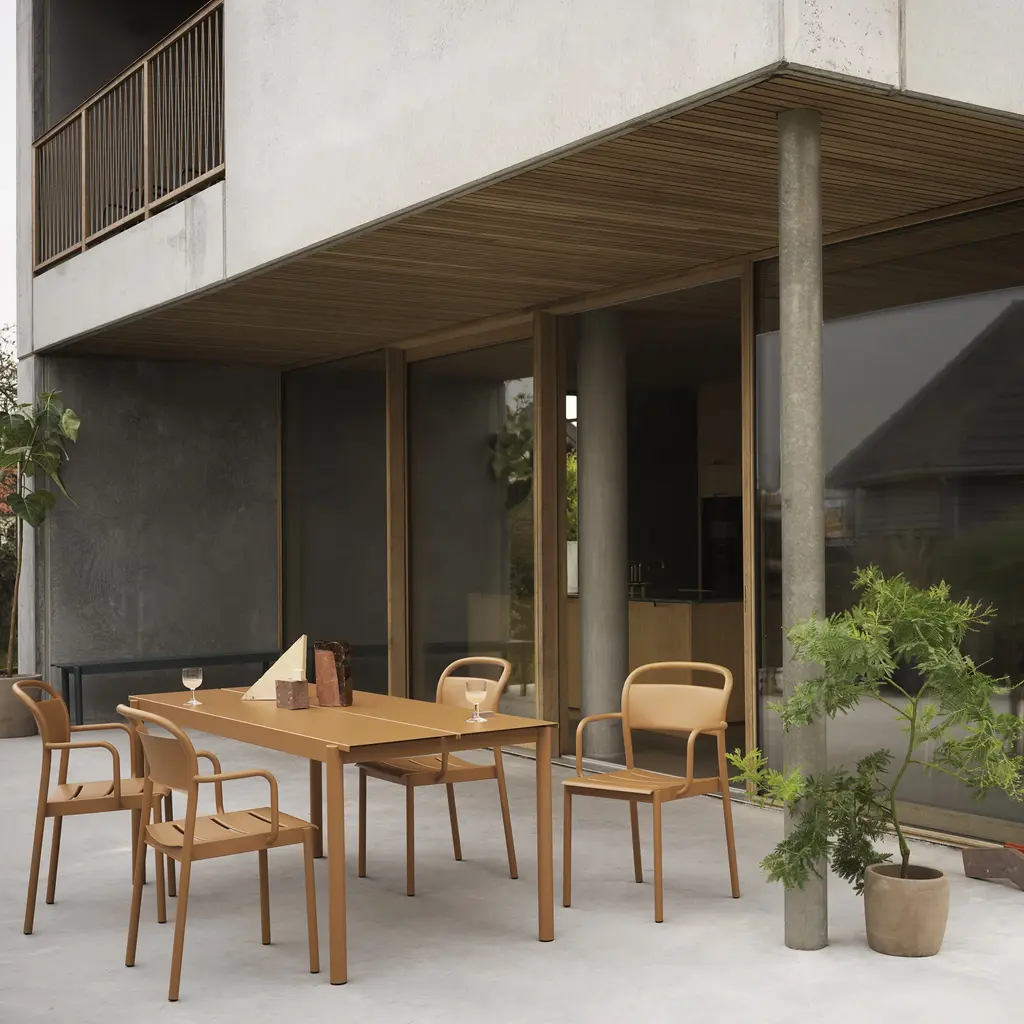 Muuto breaks out of the usual outdoor furnishings mold with a striking steel picnic table that nods to traditional planked designs. Copenhagen's Thomas Bentzen complements Linear Steel's matte-finish with fine details like folded edges and the half-circular intersecting legs. Sporting a durable powder-coat finish, the table is fabricated in welded steel and finessed to withstand the outdoors with a hot-dip galvanized tabletop and legs that are aluzinc treated.
