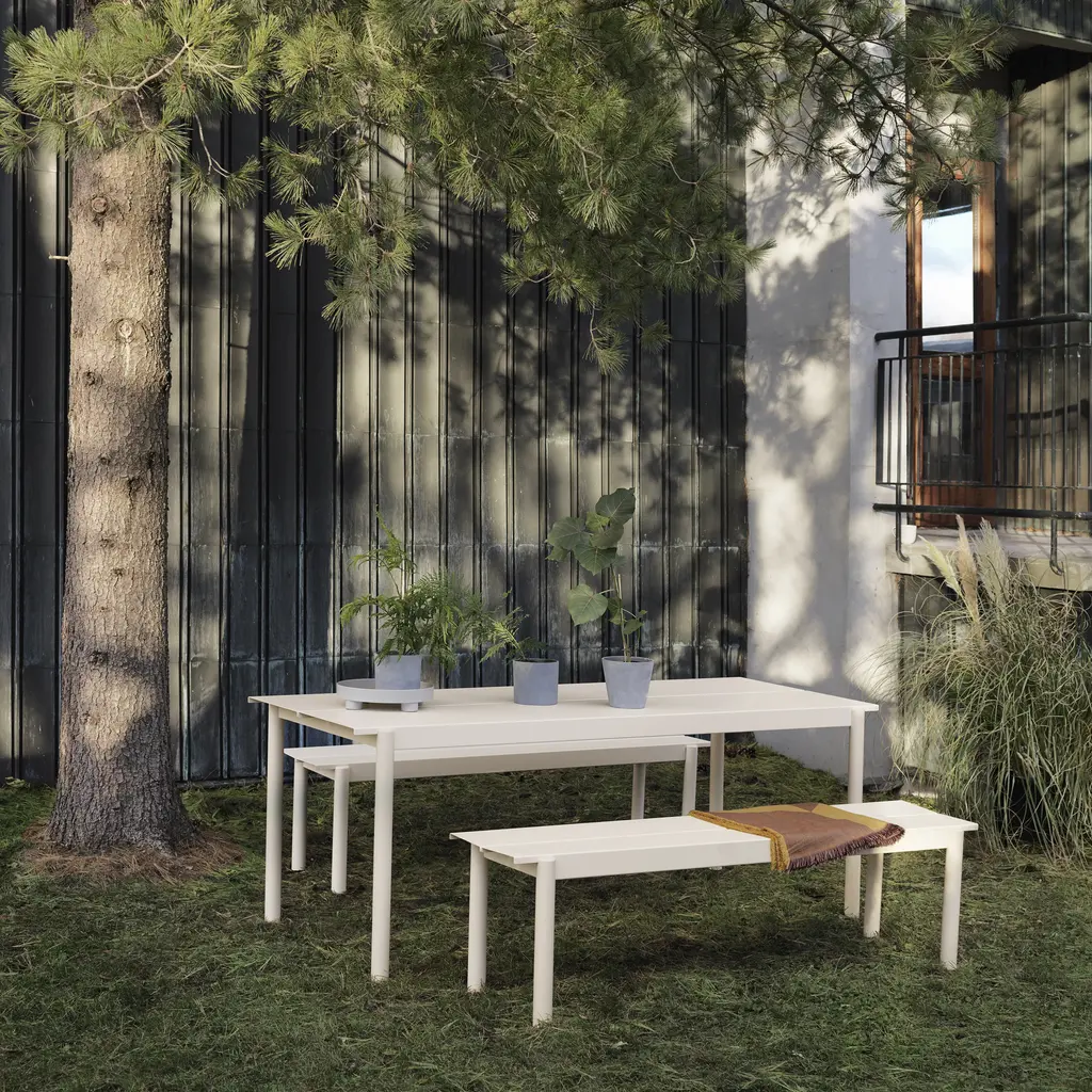 Muuto breaks out of the usual outdoor furnishings mold with a striking steel picnic table that nods to traditional planked designs. Copenhagen's Thomas Bentzen complements Linear Steel's matte-finish with fine details like folded edges and the half-circular intersecting legs. Sporting a durable powder-coat finish, the table is fabricated in welded steel and finessed to withstand the outdoors with a hot-dip galvanized tabletop and legs that are aluzinc treated.