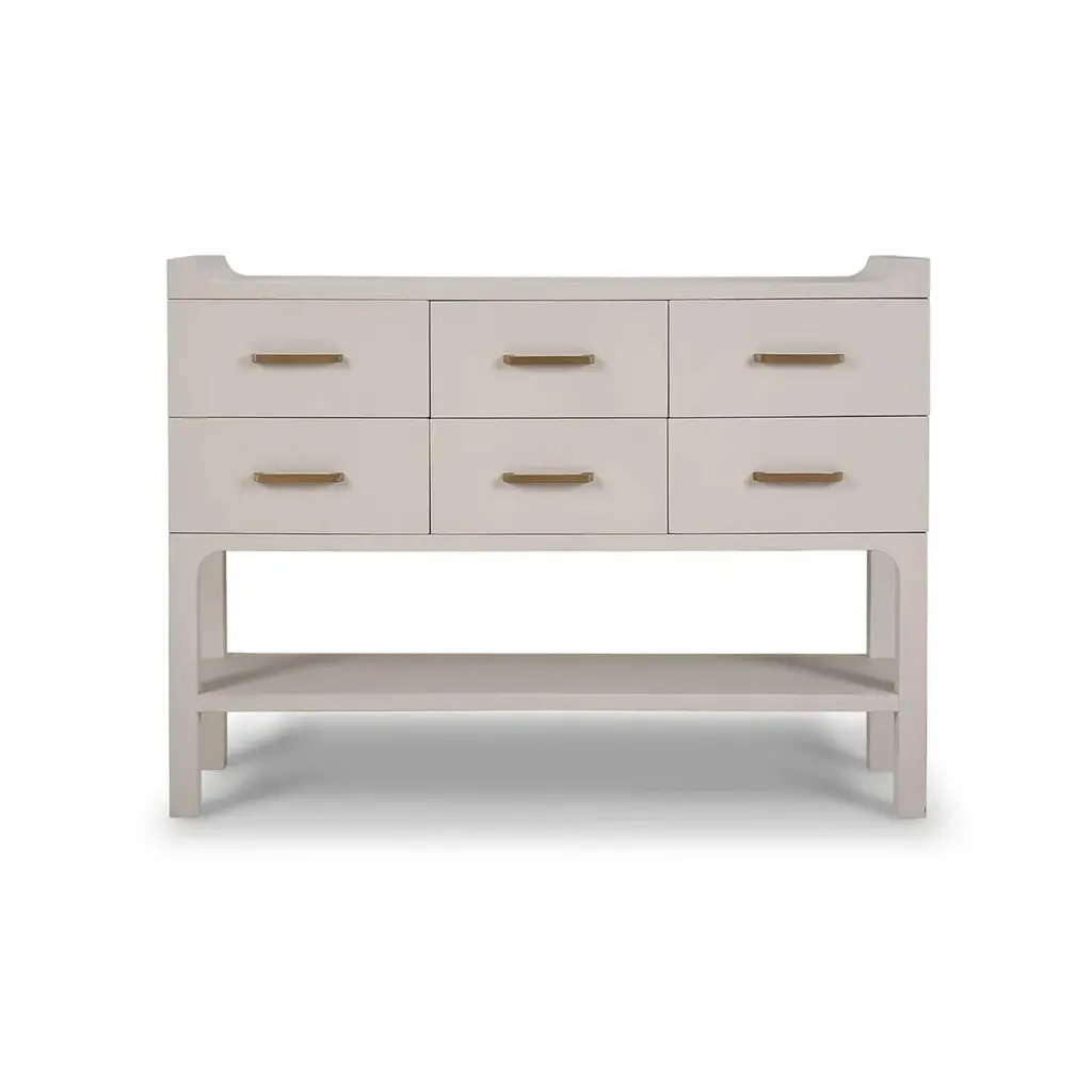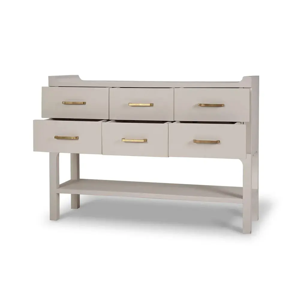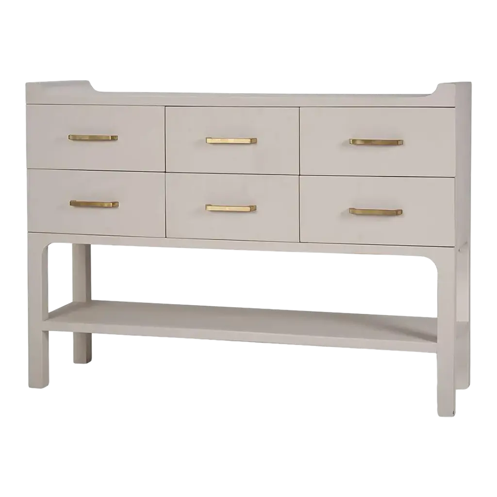 Crafted with a minimalist design, this table features clean lines and a chic, putty-colored linen wrap that perfectly captures the essence of Scandinavian style. The six spacious drawers, adorned with brass handles, provide ample storage for your essentials, making it both a stylish and functional addition to your living room, hallway, or entryway. Built with high-quality materials, this console table combines durability with contemporary aesthetics. The lower shelf offers additional space for storage or display, allowing you to keep your decor items or everyday necessities within easy reach. Dimensions: 53" W x 16" D x 39" H