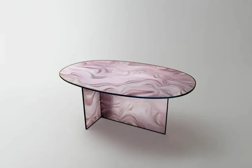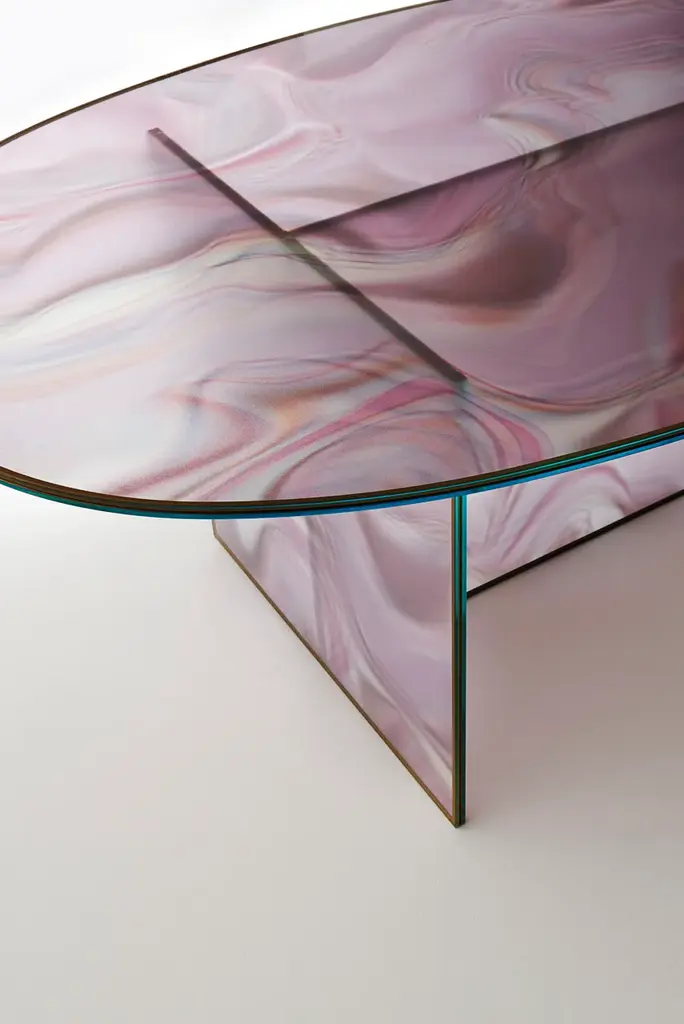 Liquefy is a high and low tables and console in tempered extralight glass with a veined and organic decoration which takes on the colour and veins of marble.The surprising image changing effect, makes the veining look dynamic and variable depending on the viewing point.Available in four different colors: green, pink-beige, whisky and anthracite-grey.The decoration is enclosed by a coordinated colour frame painted on the glass perimeter.