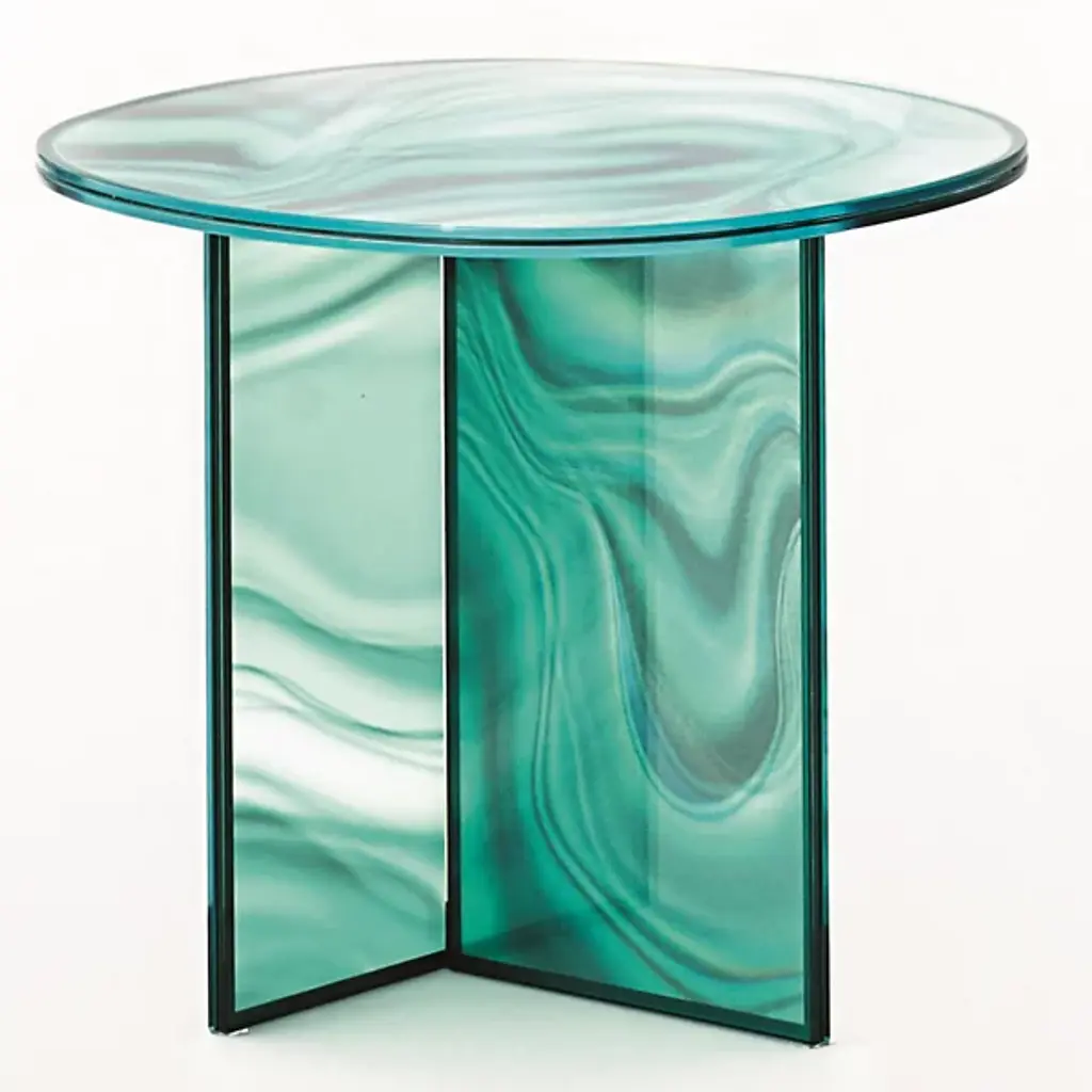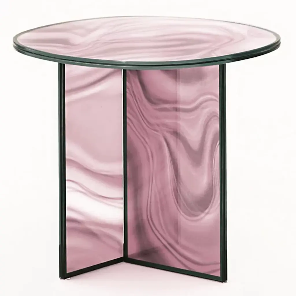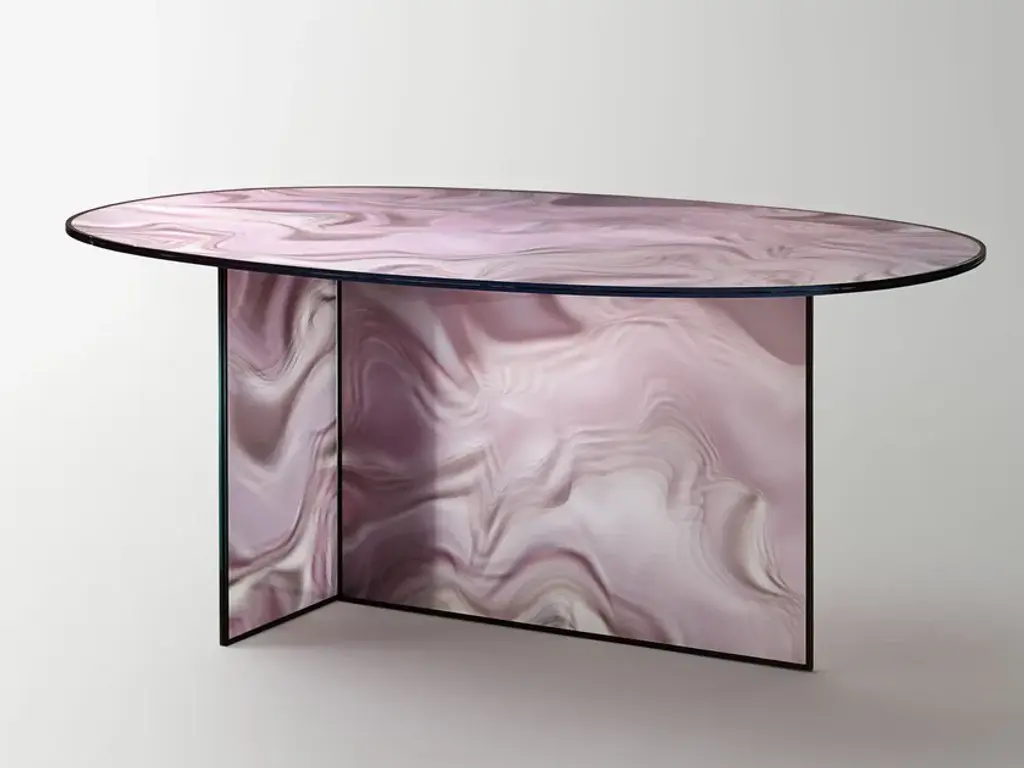 The Liquefy Table from Glas Italia features a modern and sophisticated style that combines marble’s textured look with water’s fluidity. Designed by renowned architect Patricia Urquiola, this table possesses a veined, marble-inspired pattern that appears to shift depending on your viewing angle. A matching painted perimeter frame encloses the design and draws the eye inward to the unique design. It’s made out of Tempered Extralight Glass, which brings a translucence that enhances the dynamic liquid-like appearance of this table.