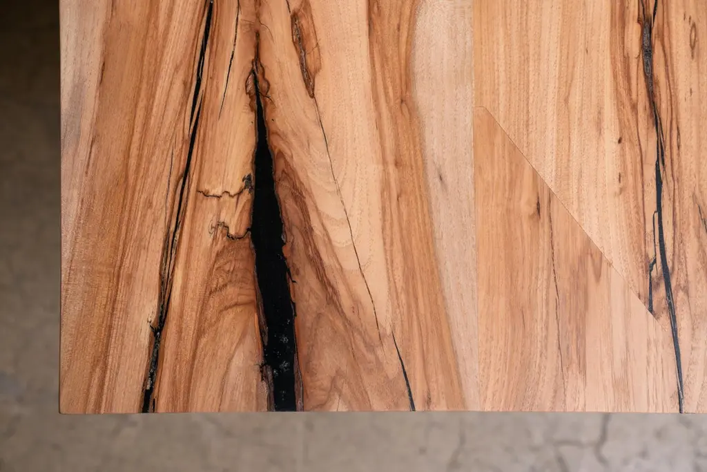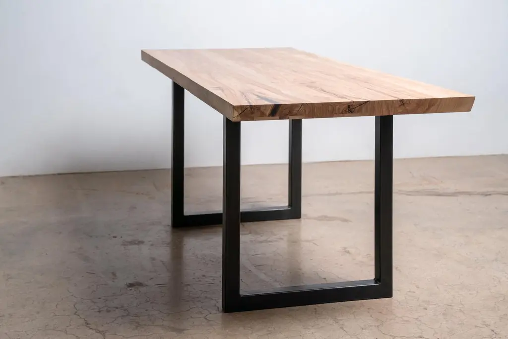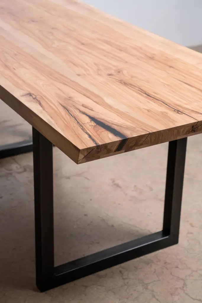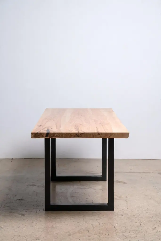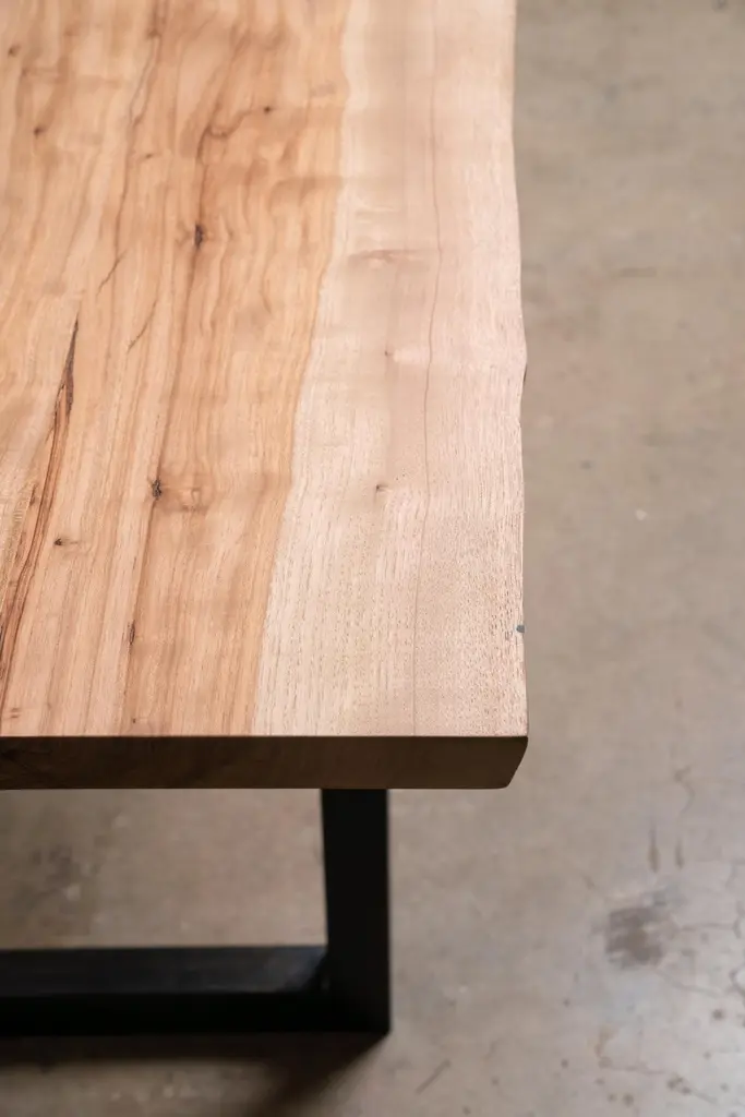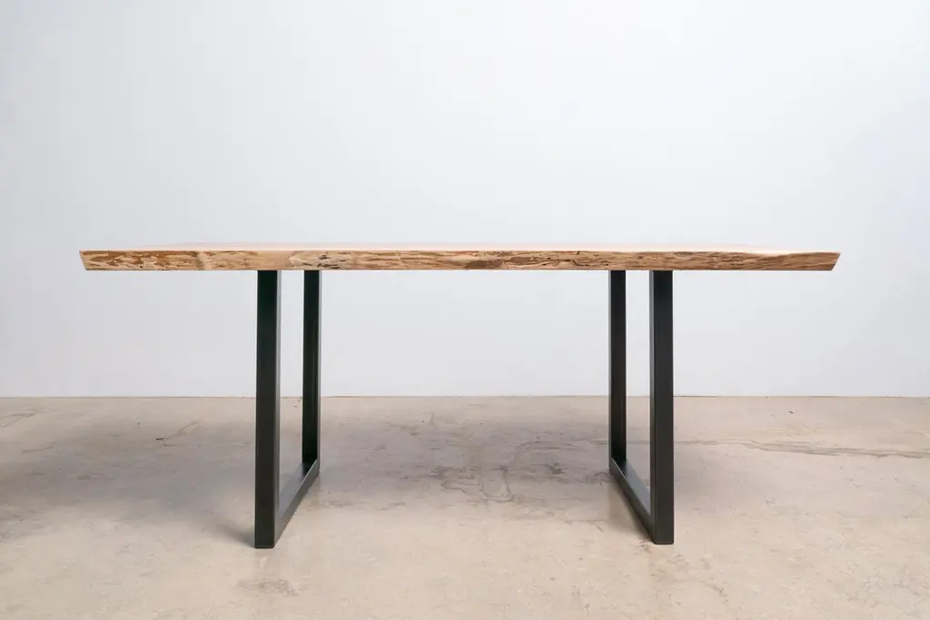 We call our live edge pecan table clear finish on Modern black steel square base a "Sunrise table", as it combines elements of minimalism, rustic and Industrial design. The distinct grain of urban timber, locally harvested in Birmingham, Alabama, plays off the elegant and modern pedestal Base. Shining as the centerpiece of a residential or commercial room, this table makes a refined statement of beauty paired with utilitarian functionality. Simple lines of strong, square steel support this intriguing, solid pecan tabletop. Always a favorite, the dramatic grain of wide planks of pecan glow through a clear surface varnish. One or two live edges is up to you, depending on the setting and use of the table.A field-to-studio company, Alabama Sawyer repurposes the finest wood species, reclaimed from our local urban forests, to create one of a kind furniture pieces and accessories for the home or business.Urban wood has character. Character can include variations in color and grain, small pin knots, evidence of historical intrusion. There may be cracks or knots that we fill, patch or join in a considered and artful way at the makers discretion. We look at every slab and decide what needs a patch or epoxy or both. Case by case, one may be more effective and better for the furniture, aesthetically, structurally, and for our process. If a specific tool, like a patch, is not desired, please specify this when ordering. This may require procuring different lumber which can alter costs.