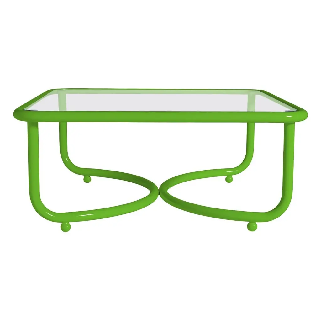 This singular and colorful low table from Gae Aulenti's 1960s Locus Solus Collection is a tribute to Pop Art and will serve as a vivacious addition for outdoor furnishings. Featuring a bright-yellow-finished cylindrical steel frame of free-flowing lines and curves that are playfully revealed through the extra-light tempered glass top: This piece will make a statement in any garden, patio, or pool side space.