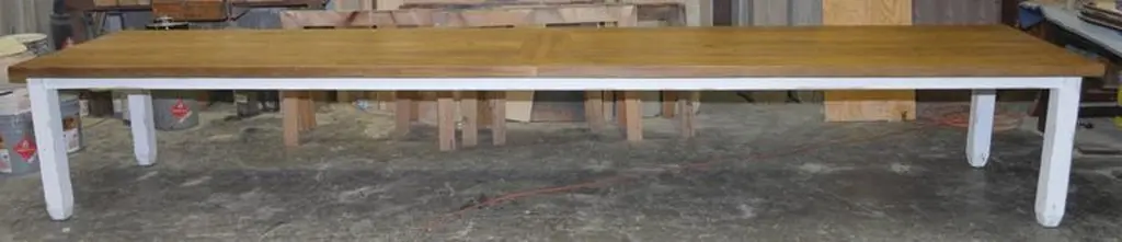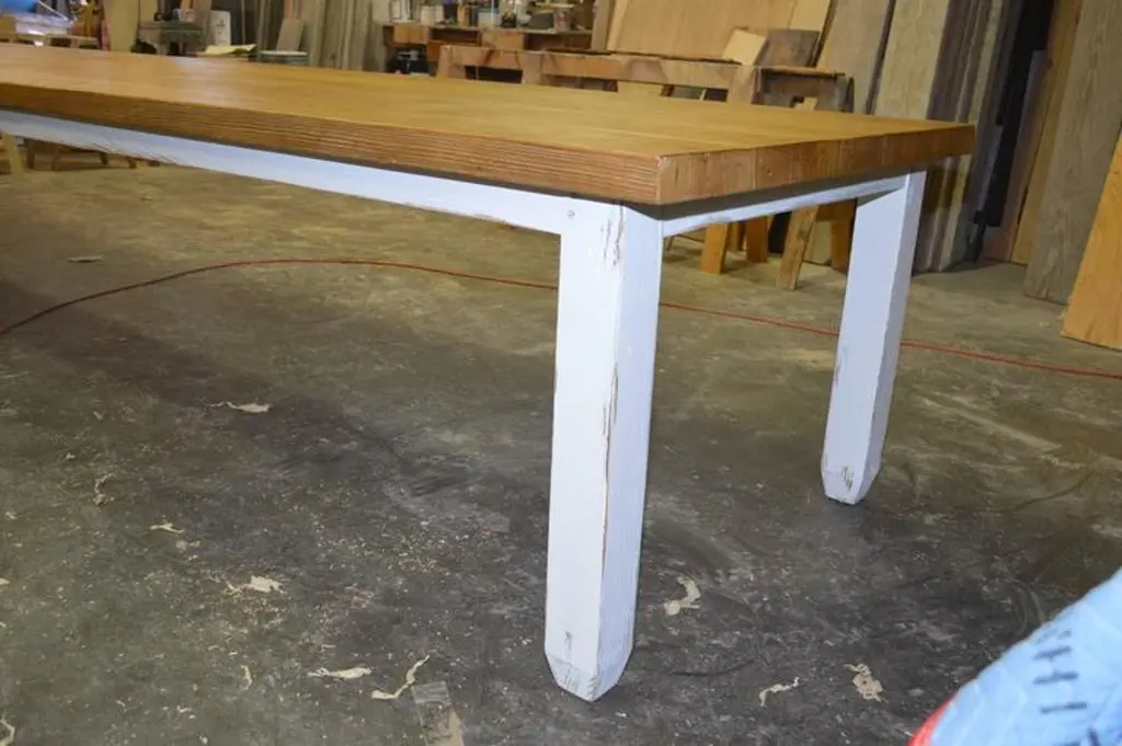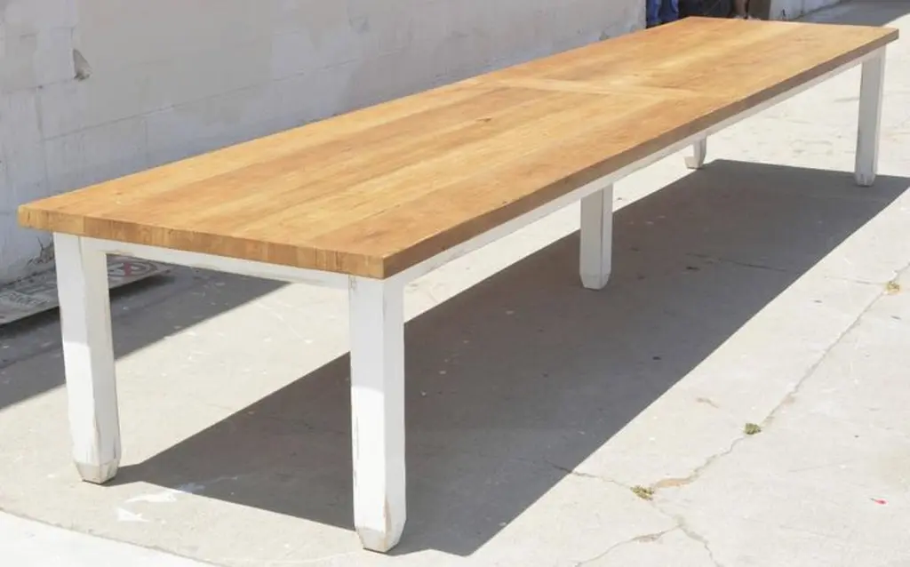 This long farm table is made entirely of reclaimed, vintage heart pine and hand selected for its beautiful patina and character. This table is 13 feet long, but can be ordered in almost any size.Because each table is bench-made in our own Los Angeles workshop you can influence all aspects of design, including size, wood specie and finish. We use only traditional carpentry techniques, no nails or metal fasteners of any kind. Just mortise and tenon construction reinforced with hand-cut wooden dowels.