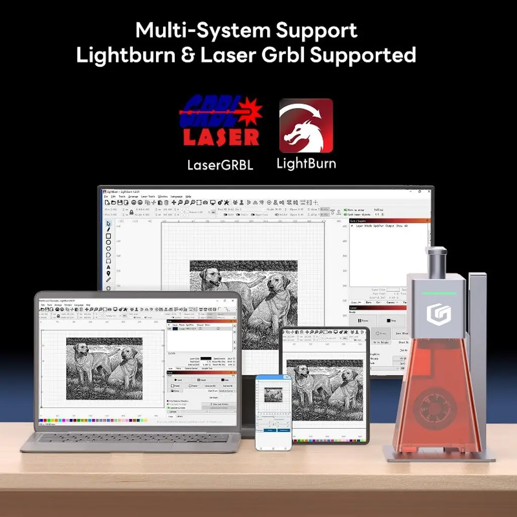 Compact 12W portable laser engraver with 5000 mm/s speed and 0.01 mm precision — cuts 10 mm basswood and 4.5 mm acrylic, engraves from any angle, and supports LightBurn, LaserGrbl, and Laserburn App.