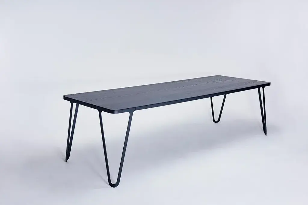 Loop table 200 ash by sebastian scherer. Dimensions: d200 x w90 x h74 cm. Materials: ash, aluminium, wood. Weight: 57.8 kg. Also available: colours:solid wood (matt lacquered or oiled): black and white stained ash / natural oak / american walnut. Frame (matt): snow white / light sand / space blue / graphite grey /dark bronze / ink black. Raw aluminium (not powder coated). Black plastic glides included. This piece is attributed to the mentioned designer/maker. It has no attribution mark and no official proof of authenticity, however it is well documented in design history. I take full responsibility for any authenticity issues arising from misattribution