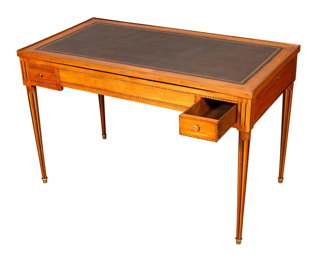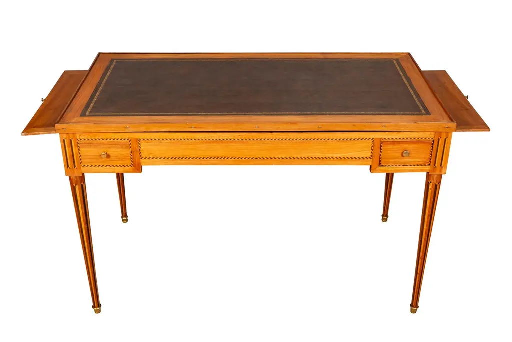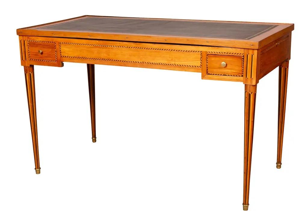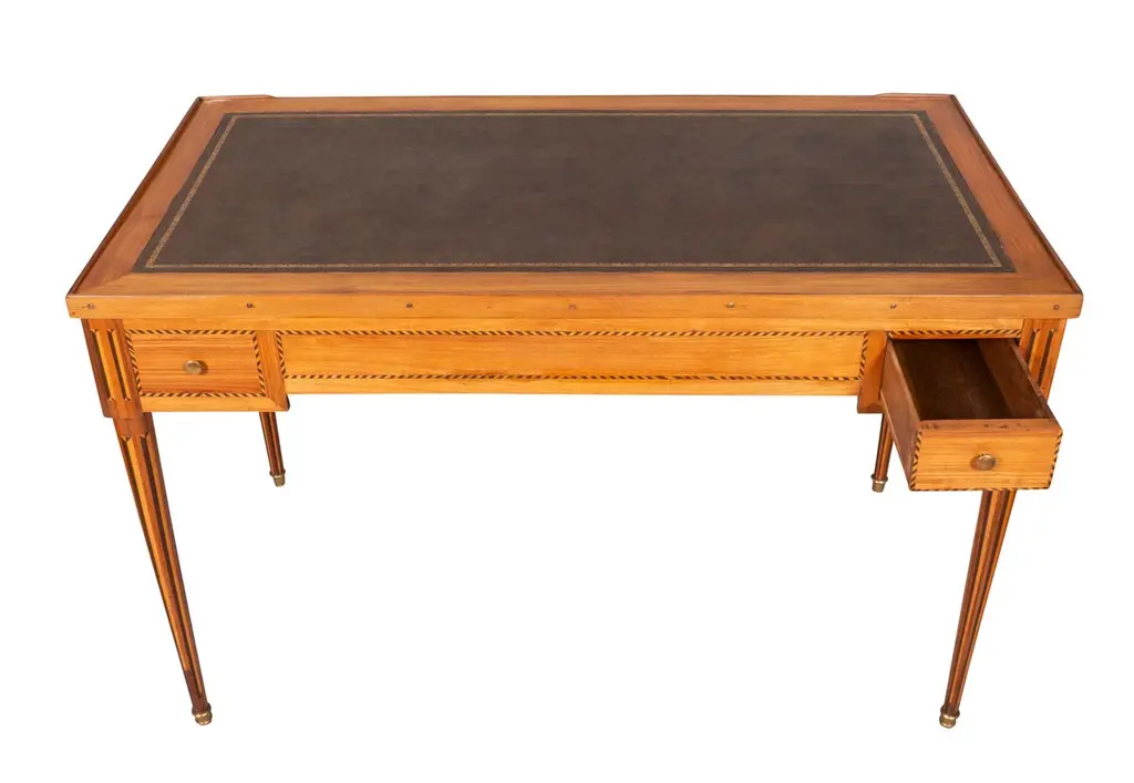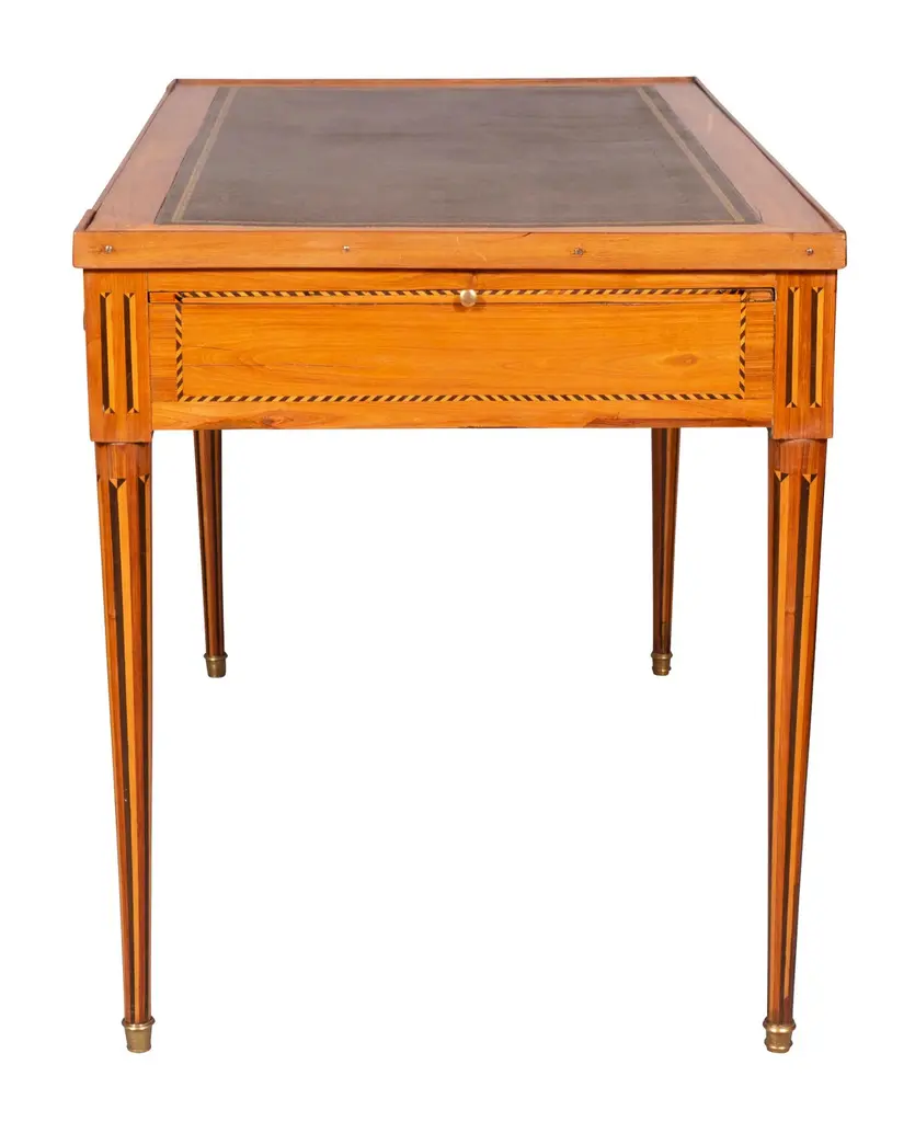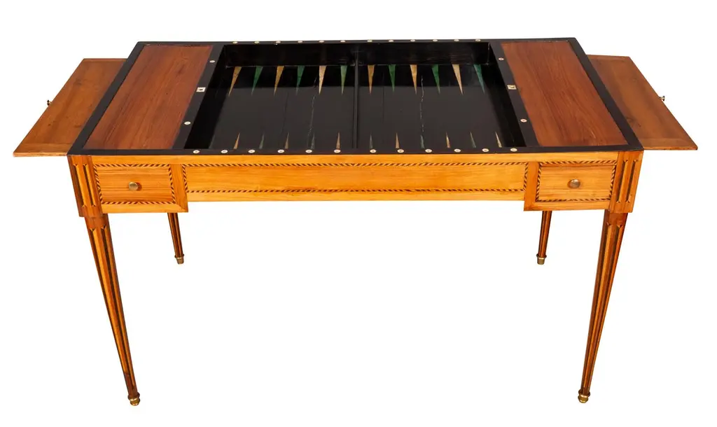 With removable rectangular top with inset leather and wood border, the reverse in green baize. All opens to a backgammon table with ebony playing surface. Each side with a small drawer, raised on circular tapered legs with vertical inlays. Sabot feet.