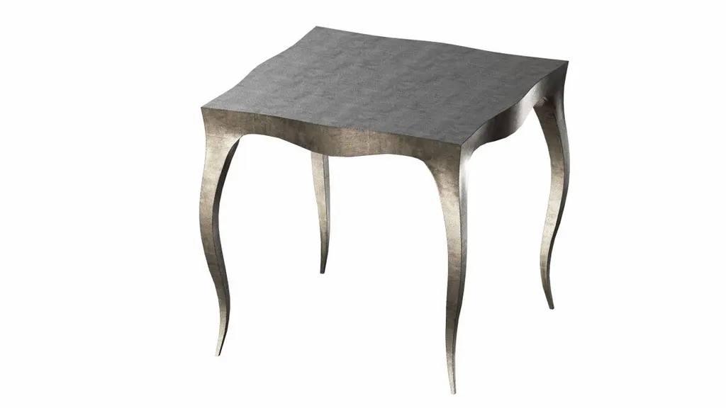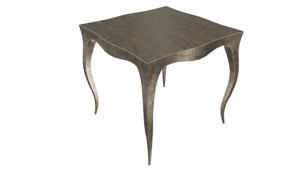 Louis Card Tables from our Louise Collection. The renowned designer Paul Mathieu chose the name “Louise” when he created his more feminine version of Louis XV (1730-1760) furniture. The characteristic cabriole leg, curving outward at the knee and inward towards the foot in an "S" shape was born during this period. It is during the same era that English furniture makers produced the Queen Anne and Chippendale styles.Crafted with utmost care and attention to detail, these Louis Card Tables are made to order and are available in twelve metal clad finishes, ensuring that you can choose the perfect one to match your individual style and taste. The use of high-quality materials and expert craftsmanship ensure that each Art Deco Louis Card Tables is not only beautiful but also a true piece of art.The curved legs and side arms of this Art Deco Louis Card Tables are hand carved from solid pieces of teak. Pattern makers trace and cut complex forms that will cover the chair in a skin of copper, white bronze, brass or antiqued white bronze The metal finishes will tarnish over time. Regular non-abrasive household metal polishes can be used to restore the original luster.Overall, if you're looking for a piece of furniture that combines luxury, comfort, and style, then the Art Deco Card Tables is an excellent choice. With its distinctive curved profile and multiple finish options, this Chair set is sure to elevate the look of any room it is placed in, and be a beloved addition to your home for years to come.The images shown in this listing are shot in different lighting conditions and/or are 3D illustrations. We encourage our customers to please request a sample or a full sample set of 12 finishes so that they can experience the finish first hand. Louise Art Deco Conference Tables Mid. Hammered Antique Bronze by Paul Mathieu for Stephanie OdegardSize- 32"x 32"x 30"HMaterials - Antique Bronze, Metal sheet, Teak, Wood, MetalTechniques: Hand-Crafted, Hand-Carved, Metal Work, Wood Work, Metal Wrapping, PolishedPlease note that moisture in air, sudden change in temperature and natural movement of wood over time causes the metal to wrinkle or bubble up. We use well seasoned, reclaimed teak and high quality marine grade MDF (wherever technically possible) to avoid and delay the mentioned changes. However a perfect stability of metal cannot be guaranteed. Please note that our smooth finish metal clad pieces will have some unavoidable tool marks. This is proof that everything is done by hand. The smooth finish will not come out like a machine made perfect surface and the master artisan will do their best to make it look as good/clean/stable/perfect as he possibly can.The antique white bronze finish is hand done by using an acidic chemical over the white bronze finish to recreate a natural patination. Like with the natural patination of silver, copper, or brass, the final result and color uniformity of the patina cannot be guaranteed. The goal of this finish is to achieve rainbow-like shades with dull, shiny, cloudy, and streaky patches to give an illusion of antiquing. Please note:None of our metal clad pieces are treated with a protective “finish” thus enabling the items to age naturally over time. We will of course polish them well before we pack them. a) Copper oxidizes faster than the other metals. In six to twelve months it will most likely lose its shine and will gradually turn to different shades of brown and/or green/blue. This aging process and its effect is referred to as verdigris. After a year the piece should not change much more. Copper does not rust, but does require periodic cleaning in order to retain its original shine if that the preferred option. ('BRASSO' or any known copper polish can be used to polish copper).b) Brass retains its shine for far longer than others, but will tarnish if not cleaned on occasion. ('BRASSO' is made to polish brass).c) White bronze, has the least tendency to show age or tarnish. If kept in a controlled climate, this metal will hold its shine for years. It can be cleaned with a cleanser and polished with a cloth. d) The antiqued white bronze finish will react with the natural elements the fastest in the beginning but it too will stop reacting and will settle down in a stable state like copper after 6-12 months. Since it is already antiqued and looked like it is tarnished, as described in an earlier message, this fast reaction will not change the over all look. In that way this surface is most forgiving. The images shown in this listing are shot in different lighting conditions and/or are 3D illustrations. We encourage our customers to please request a sample or a full sample set of 12 finishes so that they can experience the finish first hand.